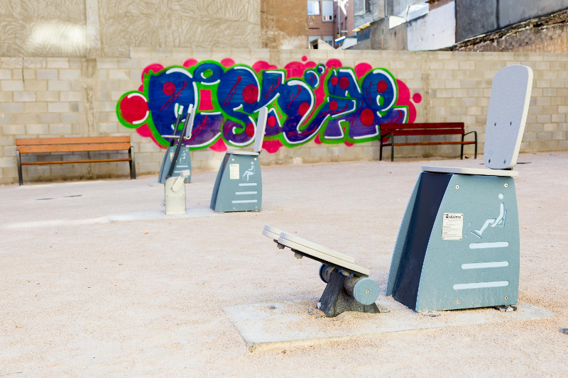 - Acondicionamiento del suelo, con movimiento de tierras,ejecución de muro de bloque de hormigón separando los solares, y colocación de 4 bancos, 1 bicicleta, 1 aparato de gemelos, y 1 aparato de pectoral y triceps