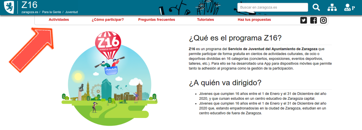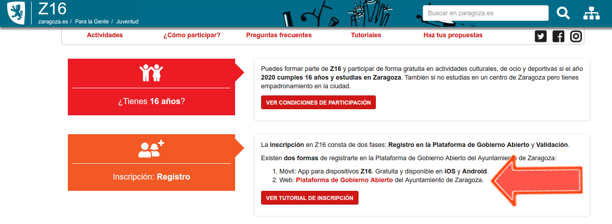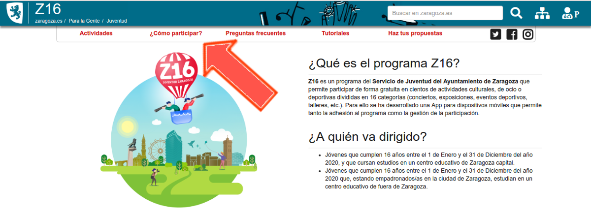 El acceso al registro se realizará mediante el sitio web Z16 (www.zaragoza.es/juventud/z16). En este sitio web, deberás entrar a la sección ¿Cómo participar?
