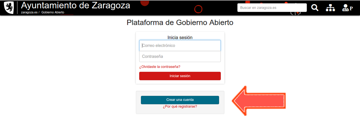 Aparecerá la pantalla de acceso a la Plataforma de Gobierno Abierto, donde tendrás que pulsar Crear una cuenta.