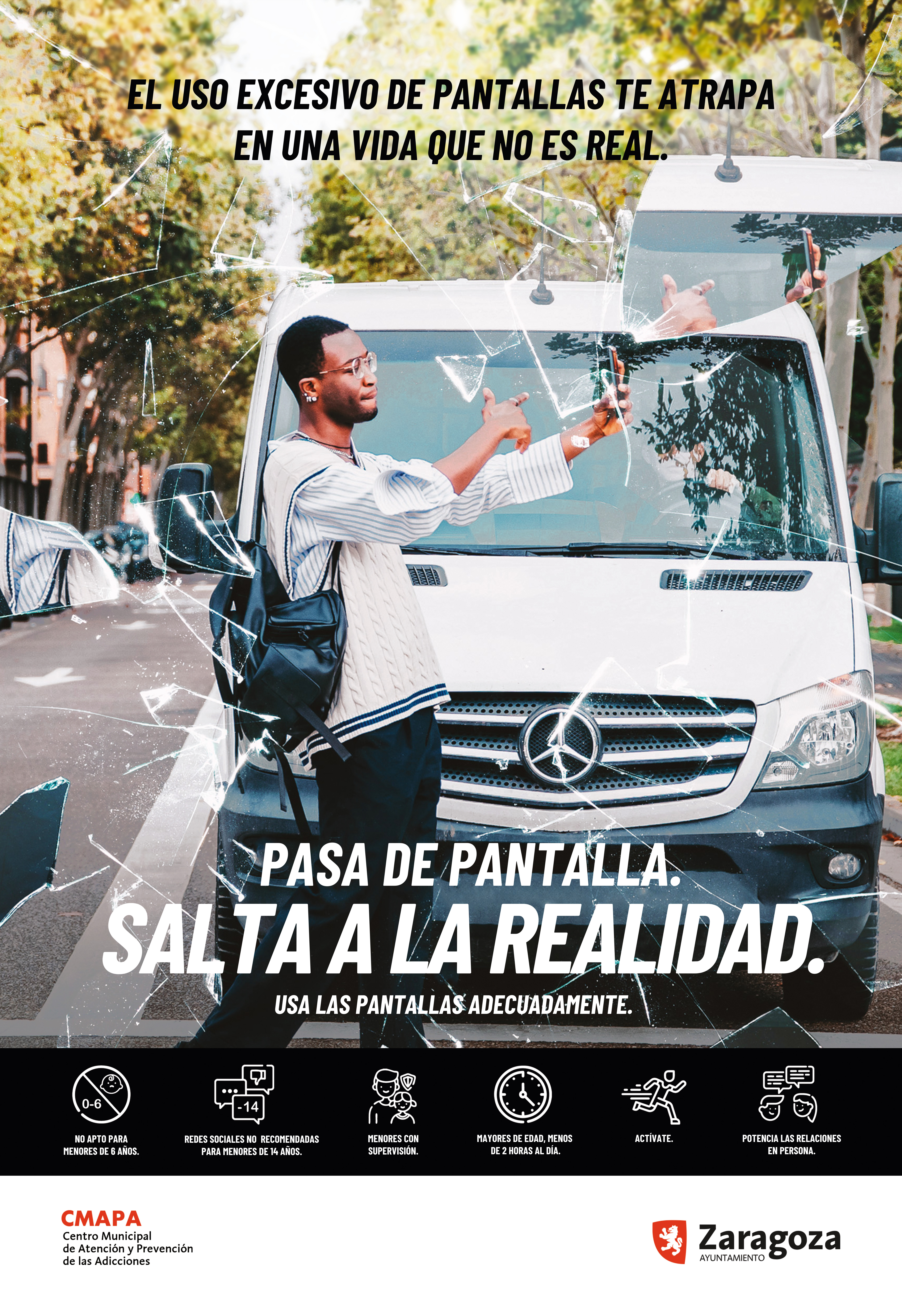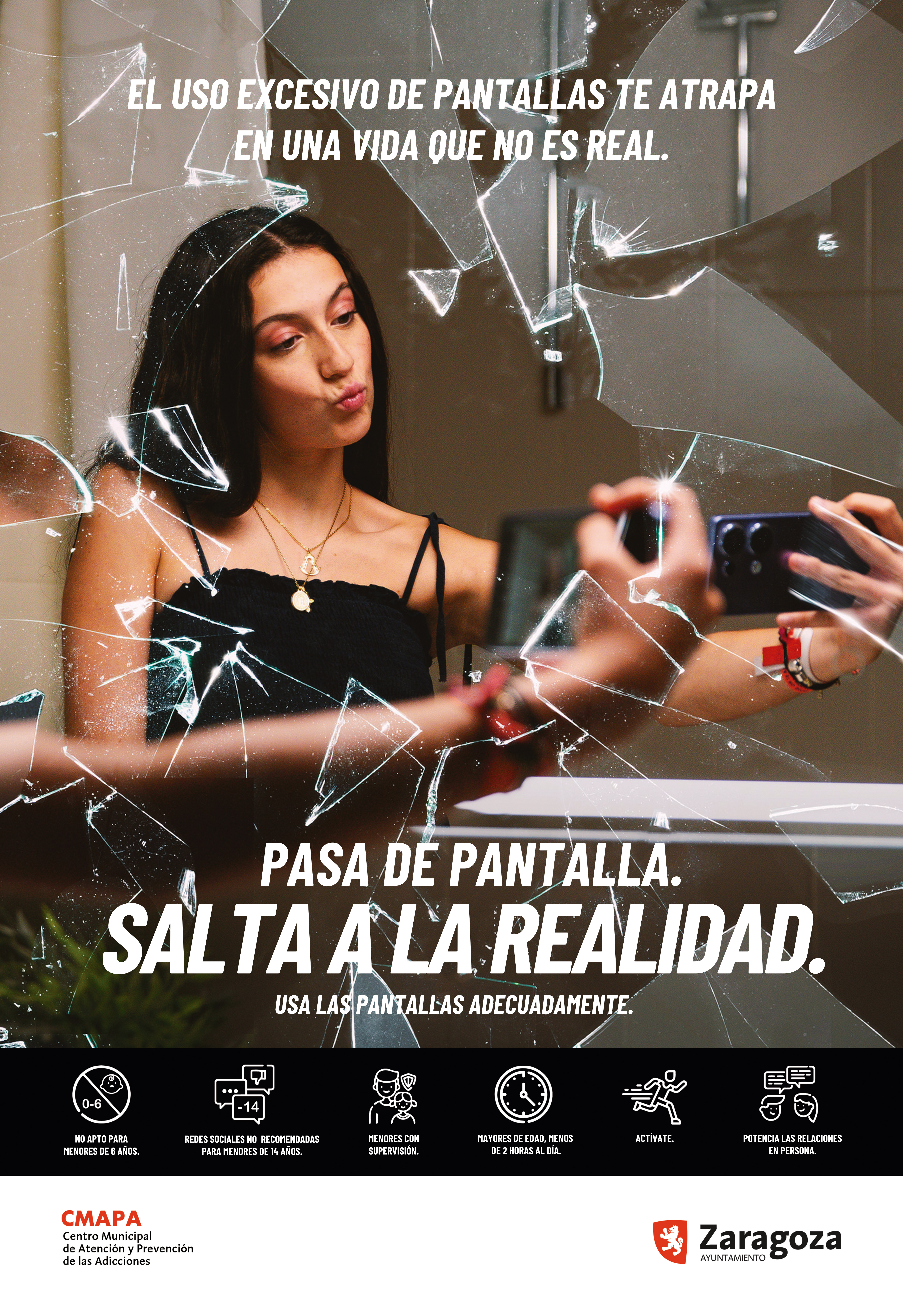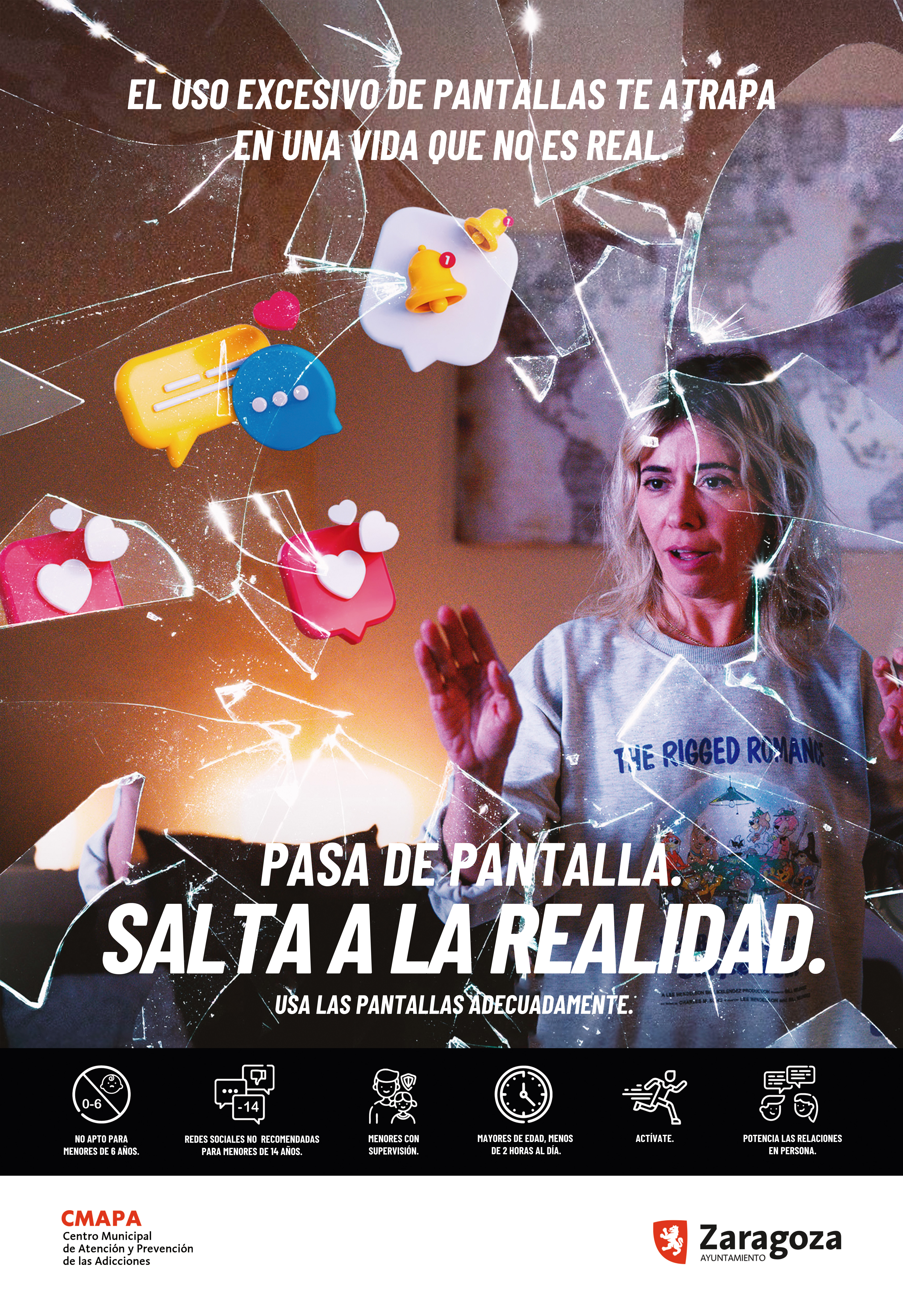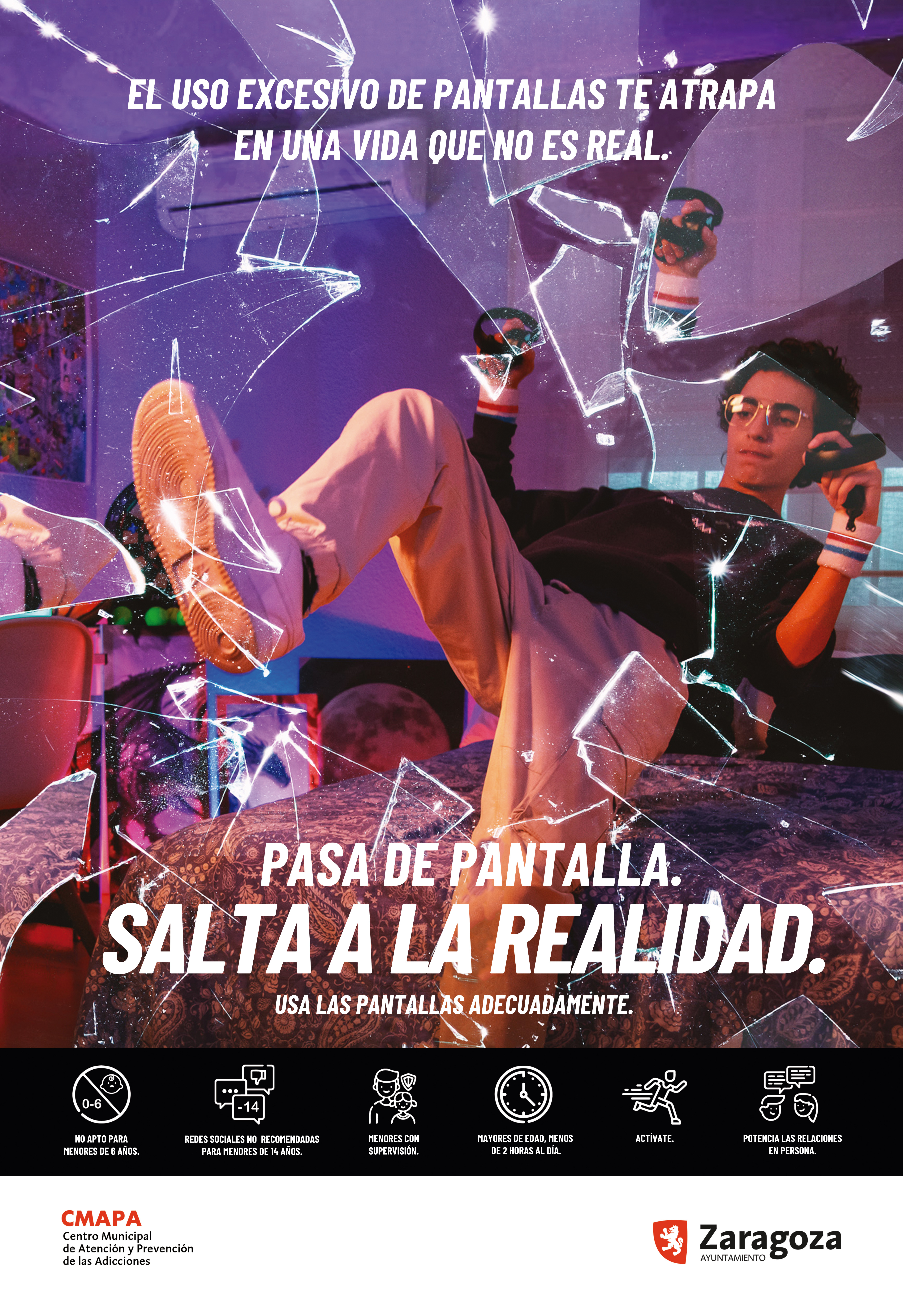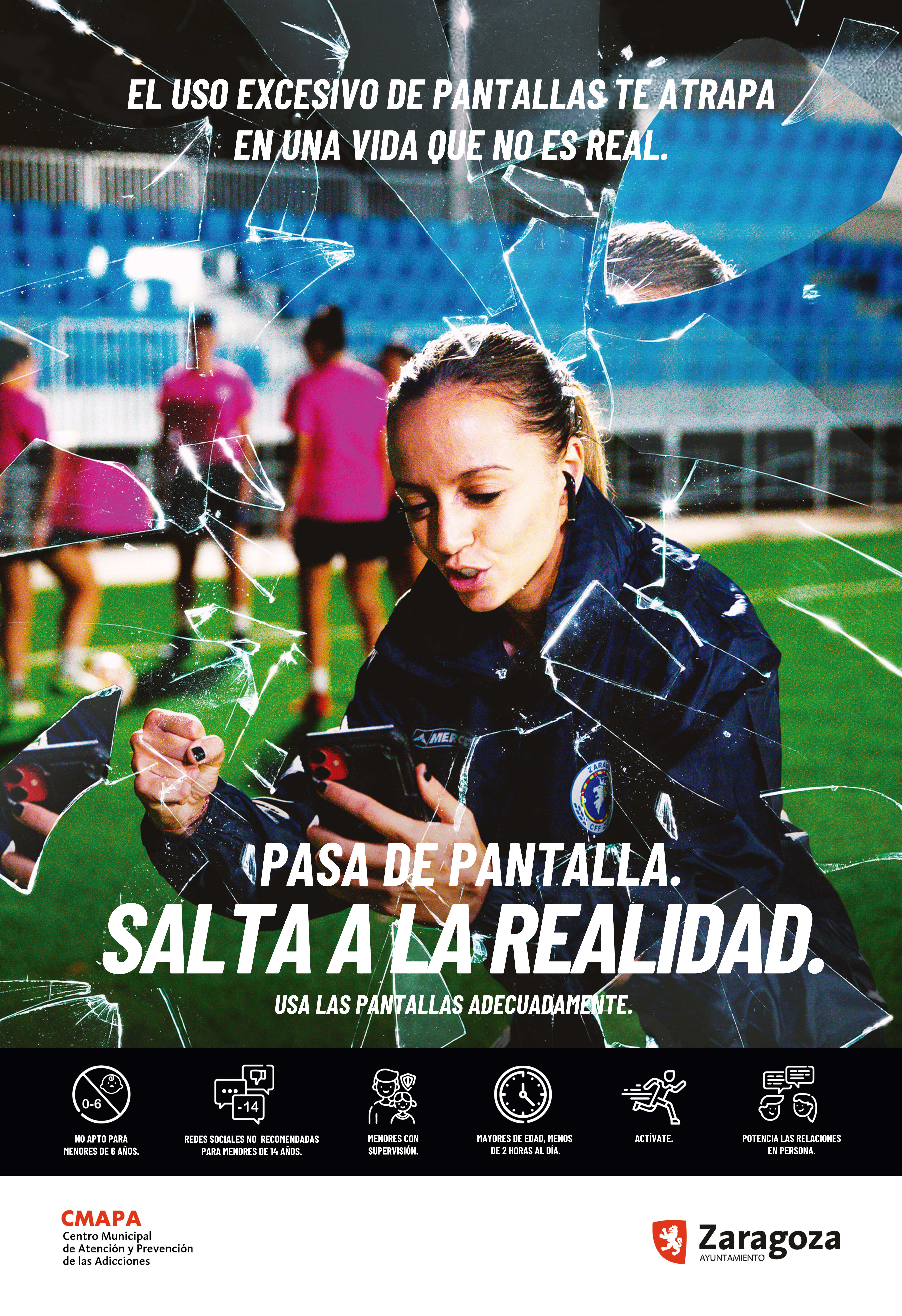 'Pasa de pantalla, salta a la realidad'. Ese es el lema de la nueva campaña del Ayuntamiento de Zaragoza para concienciar sobre los problemas que conlleva el abuso de las pantallas, la conveniencia de retrasar la edad en la que empiezan a usarse y de reducir el tiempo diario que se les dedica.