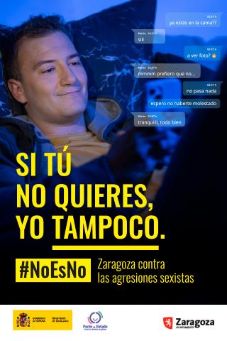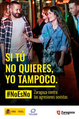 El Servicio de Mujer e Igualdad pone en marcha un año más la Campaña #NoEsNo #Zaragoza contra las agresiones sexistas para prevenir y erradicar las violencias sexistas, coincidiendo con las Fiestas del Pilar 2023, y recordando que a lo largo de todo el año es una ciudad comprometida contra las agresiones sexistas.Con el objetivo de sensibilizar y buscar la implicación de la ciudadanía para rechazar la violencia machista, esta campaña dice un no rotundo a las conductas y agresiones sexistas. El lema de esta campaña es "Sí tú no quieres, yo tampoco".