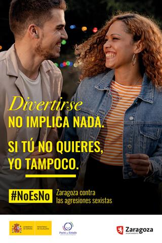 El Servicio de Igualdad y Mujer pone en marcha un año más la Campaña #NoEsNo #Zaragoza contra las agresiones sexistas para prevenir y erradicar las violencias sexistas, coincidiendo con las Fiestas del Pilar 2024, y recordando que a lo largo de todo el año es una ciudad comprometida contra las agresiones sexistas. Con el objetivo de sensibilizar y buscar la implicación de la ciudadanía para rechazar la violencia machista, esta campaña dice un no rotundo a las conductas y agresiones sexistas. El lema de esta campaña, continuidad de la anterior, es "Sí tú no quieres, yo tampoco" y pone su énfasis en tres acontecimientos cotidianos como son que "Un gesto cariñoso", "Quedar a solas" o "Divertirse" NO IMPLICAN NADA.