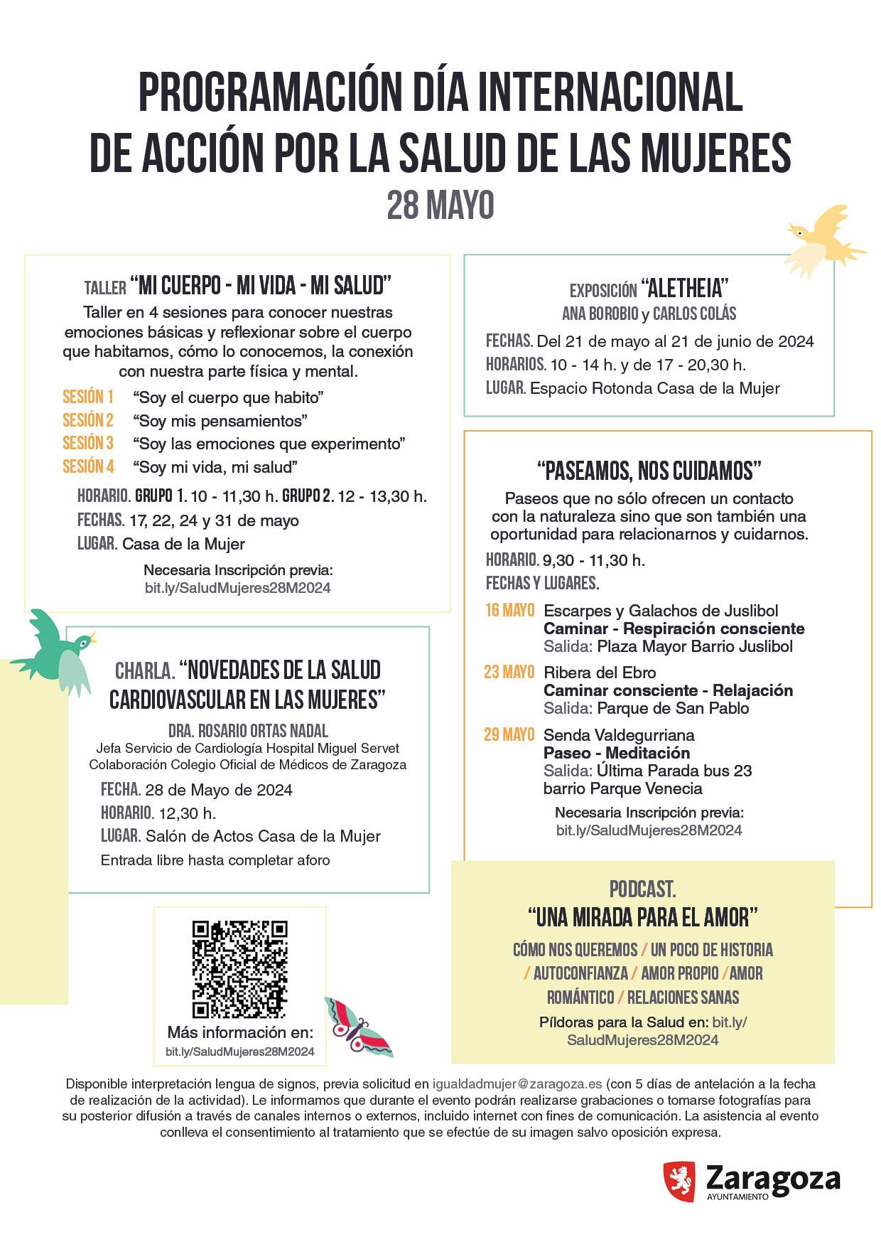 Este año realizamos seis Podcast "Una mirada para el Amor ", un Taller "Mi Cuerpo-Mi Vida-Mi Salud", unos Paseos que no sólo ofrecen un contacto con la naturalea sino que son también una oportunidad para conocer gente y cuidarnos, y como cierre una Mesa Coloquio ofrecida desde el Colegio Profesional de Médicos de Zaragoza sobre "Novedades de la salud cardiovascular en las Mujeres", actividades todas ellas con la finalidad de sensibilizar para reconocer y proteger nuestra salud, entendida esta como un derecho y tomando como referencia la definición holística e inclusiva de la Organización Mundial de la Salud que señala que dicho derecho a la salud implica gozar del más óptimo estado de bienestar físico, mental, psicológico y social, y no solamente la ausencia de enfermedad o malestar.