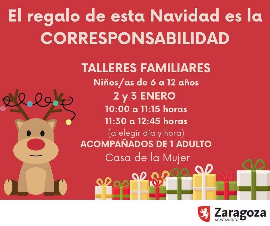 Para niños y niñas de 6 a 12 años (acompañados de un adulto) también contaremos con 4 talleres familiares "En Navidad regala corresponsabilidad" los días 2 y 3 de enero por la mañana (previa inscripción) para educar en la realización de las tareas del hogar, dónde se aprende qué es la corresponsabilidad y cómo ser responsables según nuestra edad y posibilidades.
