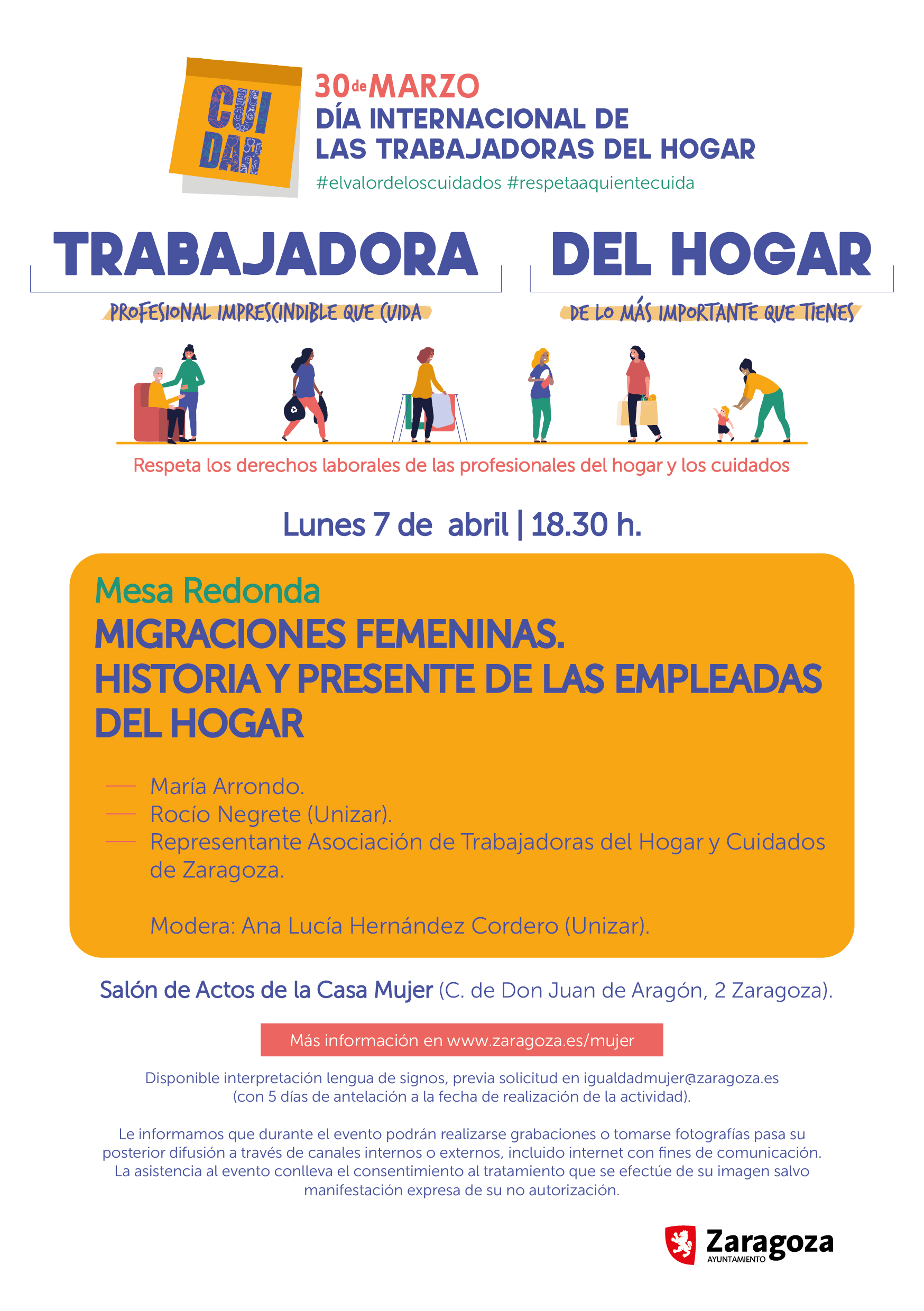 Además de la elaboración de materiales gráficos (carteles, vinilos en los autobuses) para su difusión, se programa una actividad el lunes día 7 de abril tendrá lugar una Mesa Debate en la que participan María Arrondo, Rocío Negrete (Unizar) y una representante de Trabajadoras del Hogar y Cuidados de Zaragoza. Estará moderado por Ana Lucía Hernández Cordero (Unizar).