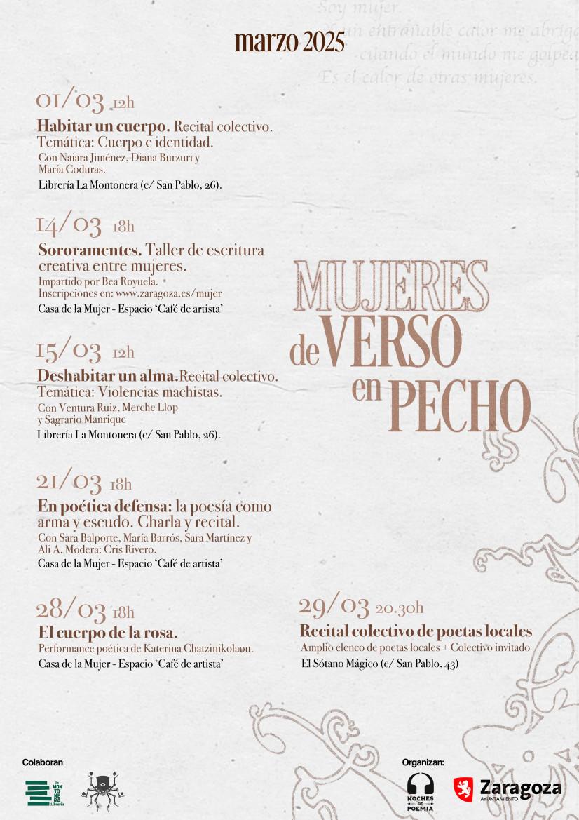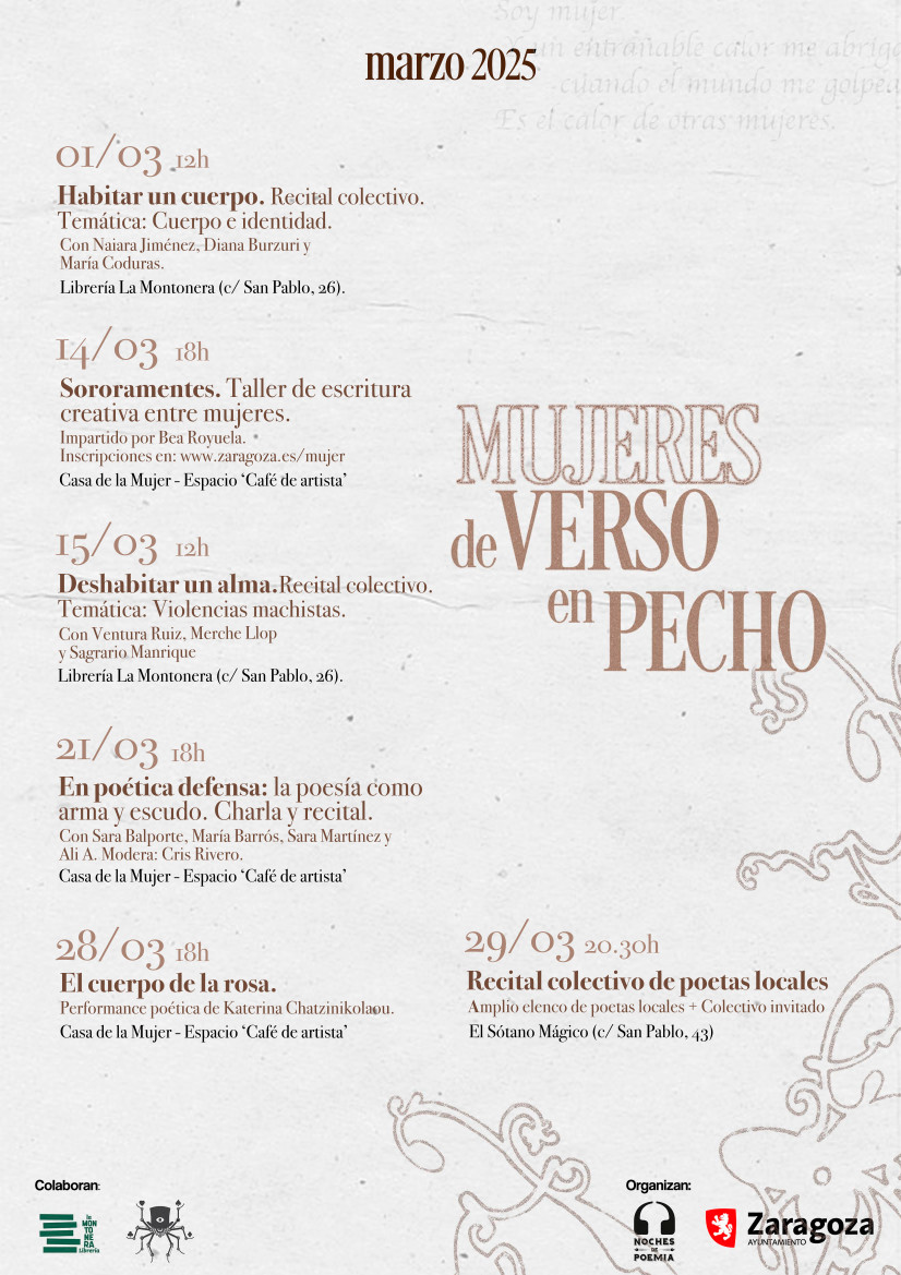 Así, las protagonistas de este ciclo de eventos poéticos, más allá de nombres propios, es la mujer como sujeto colectivo. Se darán voz a sus diversas realidades en recitales colectivos, micros abiertos y otras actividades propuestas en Mujeres de verso en pecho alrededor del mes de marzo.