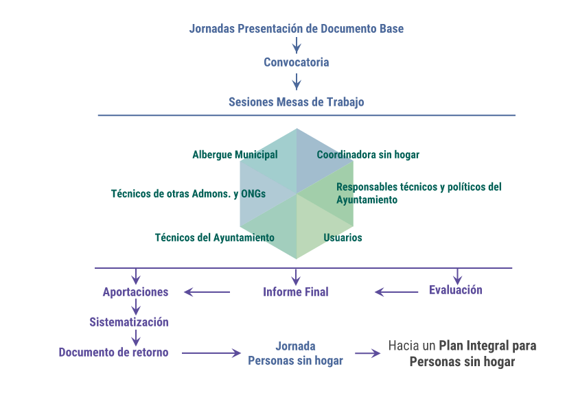 El Área de Derechos Sociales manifiesta en el Documento Base del Plan Integral "la necesidad de poner a todos los actores sociales de la ciudad del ámbito del sinhogarismo en el escenario del diálogo, de la reflexión compartida, de la búsqueda de objetivos comunes. Estas razones nos llevan a proponer la celebración de una serie de mesas de trabajo, como espacios de encuentro, dialogo, reflexión y consenso entre la diversidad de actores sociales que, en nuestra ciudad, trabajan en pro de las personas sin hogar."
