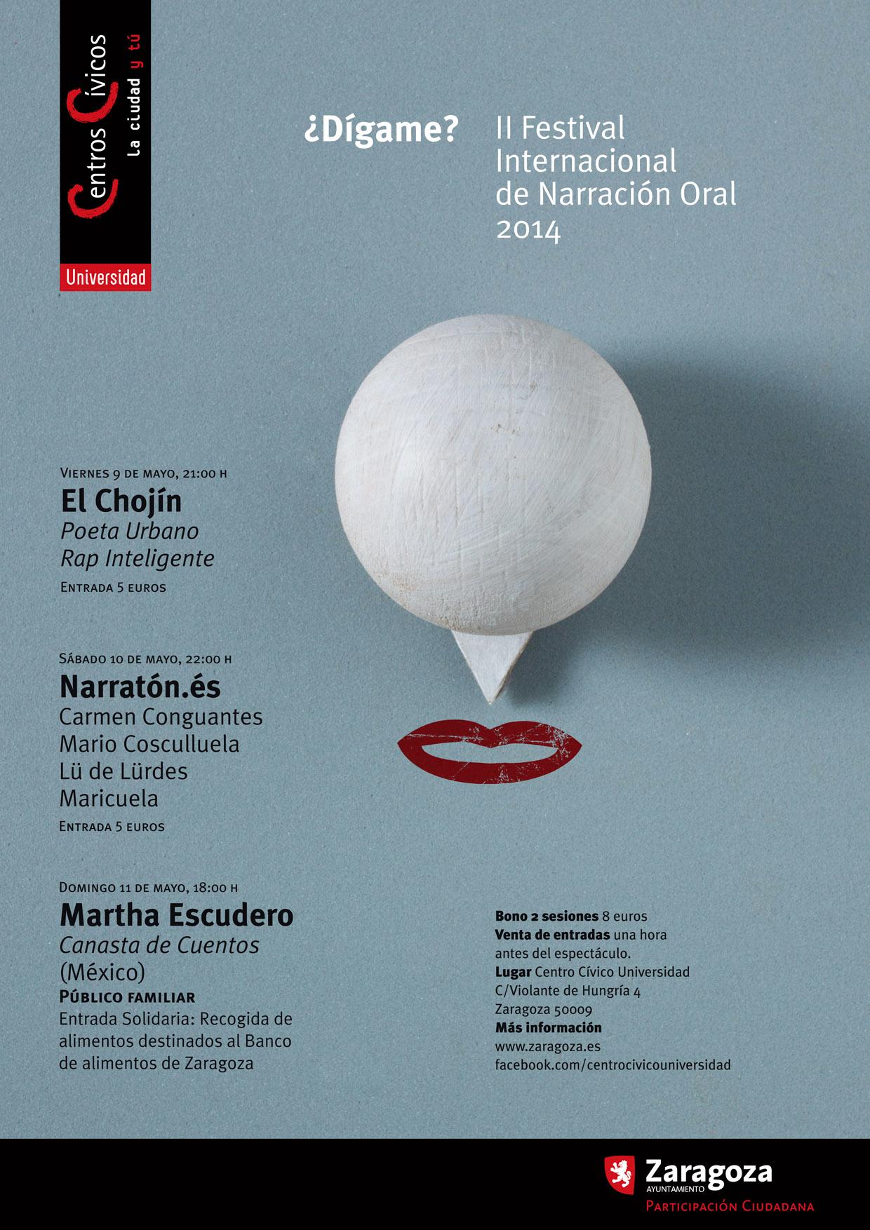 Este próximo fin de semana, días 9, 10 y 11 de mayo, se desarrollará en el Centro Cívico Universidad (C/Violante de Hungría, 4) la programación cultural que lleva por título "Dígame" II Festival Internacional de Narración Oral, en el que los asistentes podrán disfrutar de un encuentro con el rapero El Chojin, de un maratón de narradores aragoneses, así como de narraciones a cargo de la narradora oral mejicana Martha Escudero.