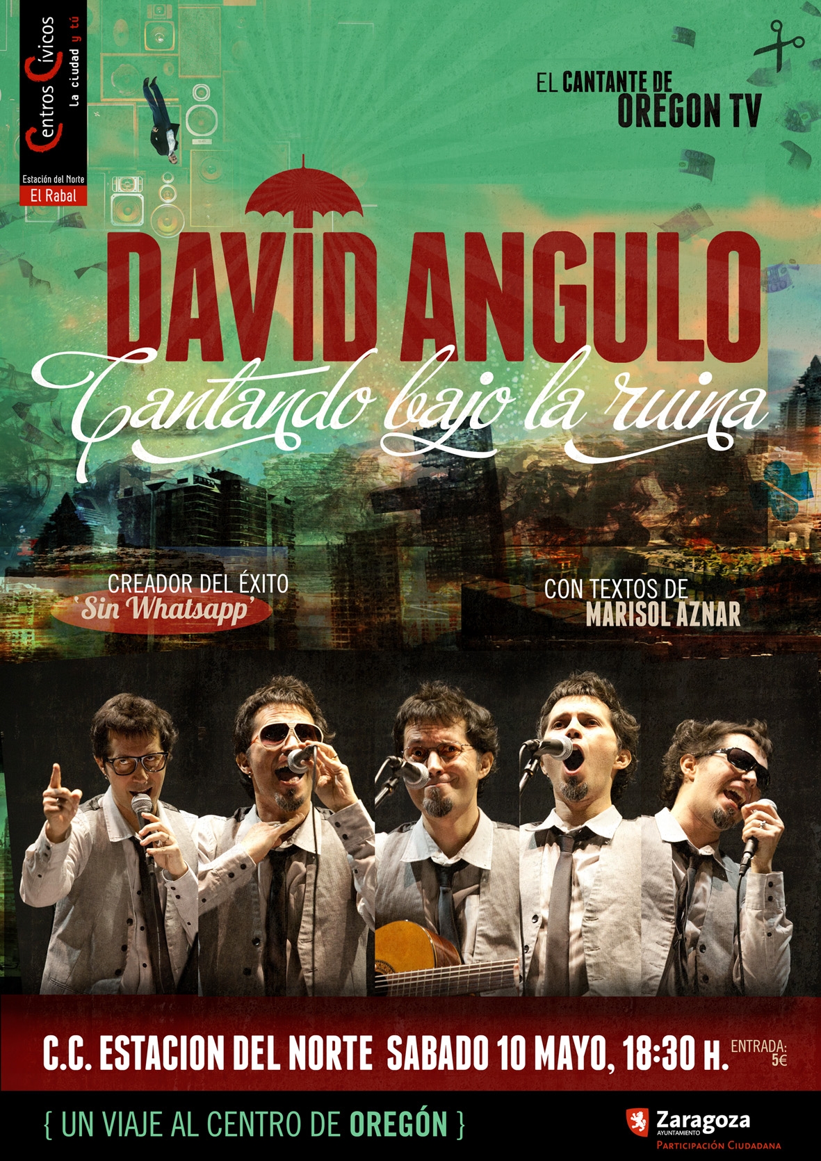 Mañana sábado 10 de mayo, y dentro de la programación del ciclo cultural "Viajando Experiencias..." 2014 que se está desarrollando en los Centros Cívicos Estación del Norte y Tío Jorge, informar que los asistentes podrán pasarlo bien con el concierto que, con el título "Cantando bajo la ruina", ofrecerá David Angulo. Este cantante de Oregón TV, creador del éxito Sin Whatsapp, y con textos de Marisol Aznar, realizará un viaje al centro de Oregón.