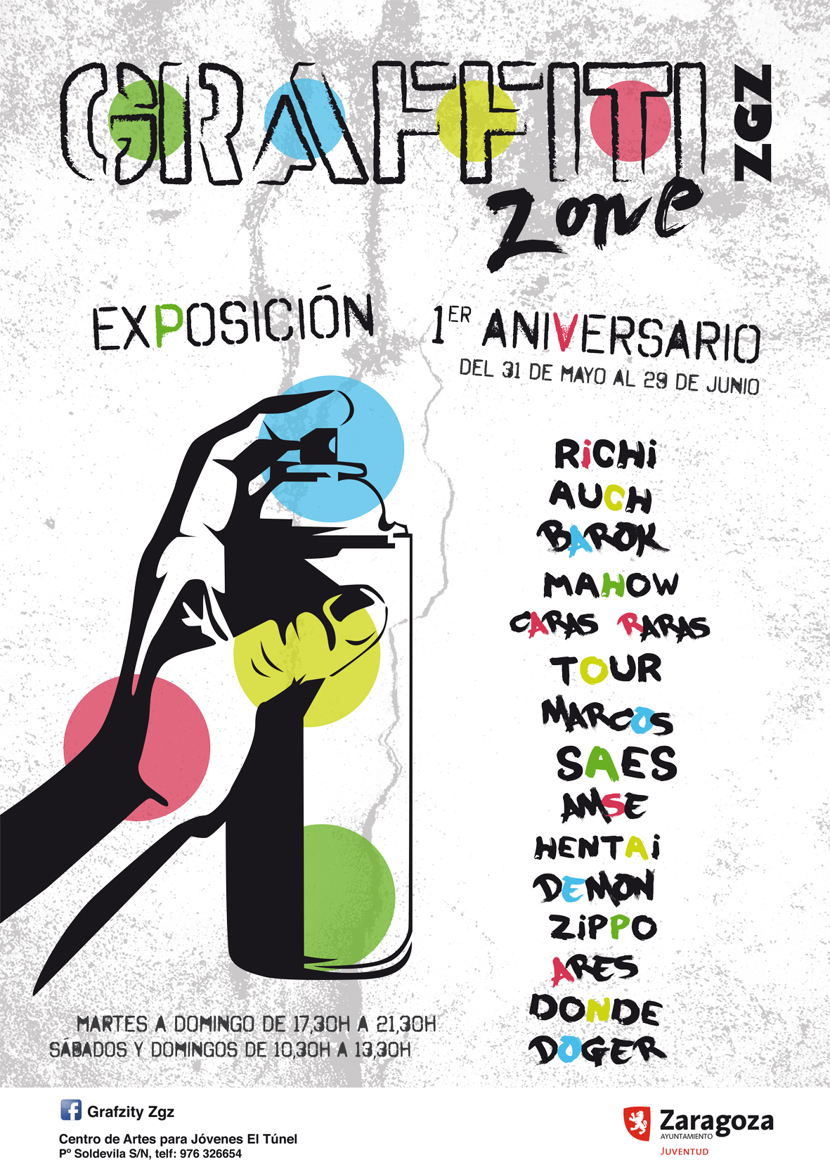 El Centro de Artes para Jóvenes, El Túnel de Oliver, organiza una exposición fotográfica de las intervenciones que se han realizado a lo largo de este primer año de vida del Graffiti Zone Zgz. Esta muestra estará abierta al público del 30 de mayo al 29 de junio, de martes a domingo, de 17:30 a 21:30h y el sábado y domingo también de 10:30 a 13:30h.