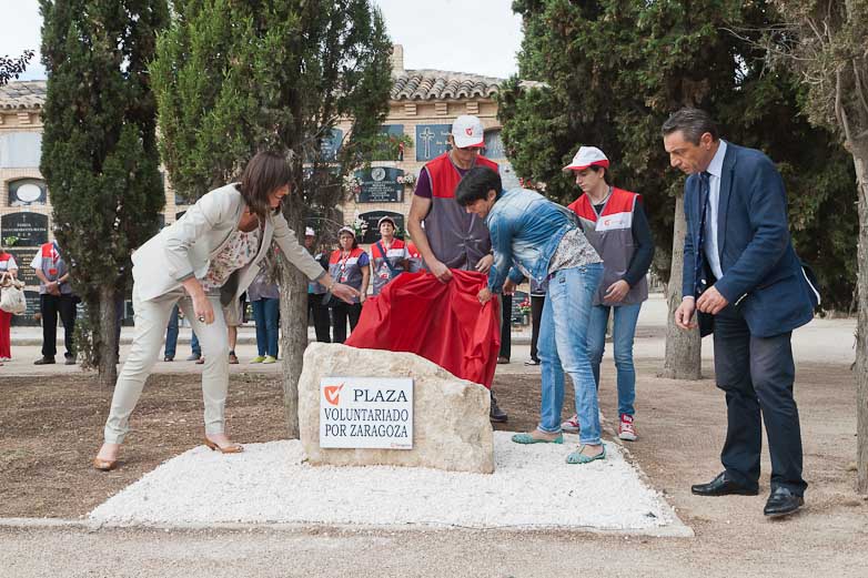 El acto ha comenzado dando nombre a la plaza situada en el cementerio viejo de Torrero en la que se ha colocó el pasado año la escultura 'Paloma del Voluntariado', del escultor de Torrero, José Antonio Barrios. Ese lugar, que desde el pasado año se denomina Plaza Voluntariado por Zaragoza, tendrá una placa de cerámica de Muel, que se ha descubierto al inicio del acto, para recordar su vinculación con el movimiento ciudadano.