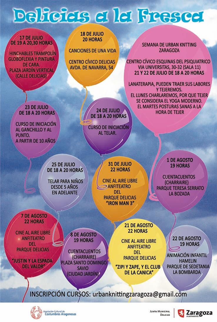 Un año más el Ayuntamiento de Zaragoza pone en marcha una nueva edición del programa cultural Delicias a la Fresca, que se desarrollará a lo largo de distintos días de los meses de verano, de julio y agosto, con diferentes actividades que se llevarán a cabo en los parques del distrito Delicias, así como en los Centros Cívicos del distrito, Delicias (Avda. Navarra, 54), y Esquinas del Psiquiátrico (Vía Universitas, 30-32).