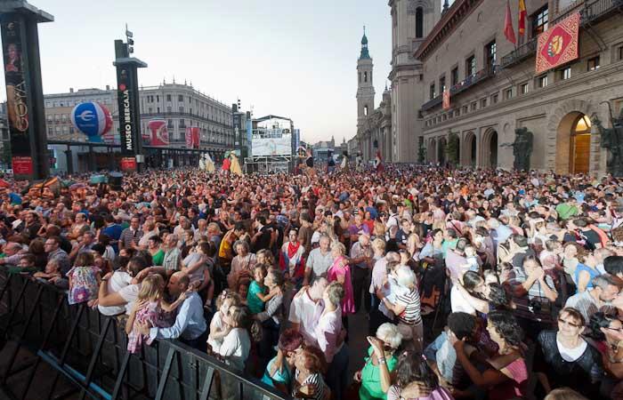 Desde las 18.30 horas, con el desfile de la comparsa de Gigantes y Cabezudos, la gente comenzaba a acercarse y llenar la plaza para participar en la quedada de Bésate por Zaragoza. Pocos minutos después de las 19.00 horas, el humorista Javier Coronas salía al escenario y comenzaba a presentar a personas y personajes para que recordaban sus besos. Con ese telón de fondo se ha llegado al momento decisivo, cuando Coronas ha animado a los miles de zaragozanos congregados a darse un beso. Así, durante unos minutos, la plaza del Pilar ha recreado el cartel de estas fiestas este año, titulado El Besico.