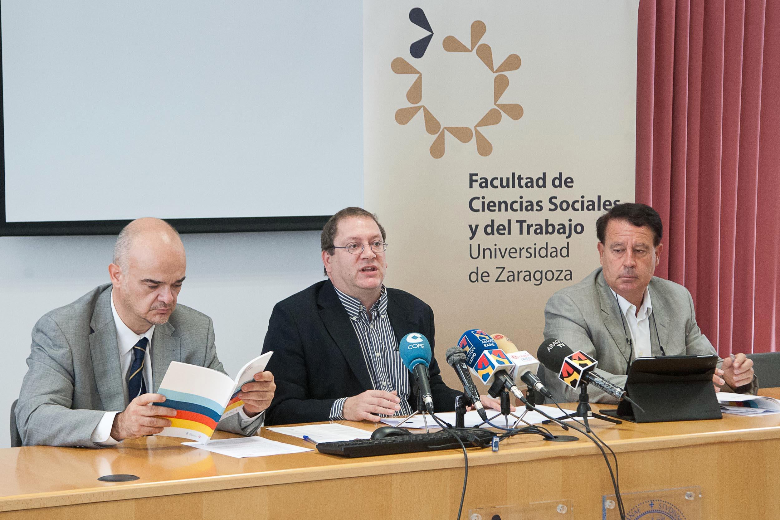 El vicepresidente de la Sociedad Municipal Zaragoza Vivienda, Jerónimo Blasco, el co director de la Cátedra Zaragoza Vivienda, Julio Tejedor, y el profesor del departamento de Psicología y Sociología de la Universidad de Zaragoza, Jaime Minguijón han presentado hoy el estudio "Exclusión residencial en la ciudad de Zaragoza. Hacia un sistema de indicadores" en el marco de los trabajos emprendidos y promovidos desde la La Cátedra Zaragoza Vivienda.
