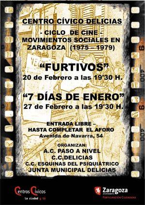 Integrado dentro de la exposición Movimientos Sociales en Zaragoza (1975-1979), el Centro Cívico Delicias (Avenida Navarra, 54) acoge un ciclo de cine, cuya primera proyección tiene lugar a las 19,30 horas de hoy viernes, 20 de febrero, con la película titulada Furtivos.