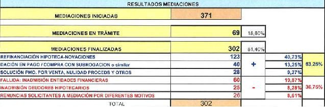 • 63,25% mediaciones finalizadas positivamente: refinanciación hipoteca-renovaciones, dación en pago, compra con subrogación, solución préstamo por venta, nulidad de procesos, etc.