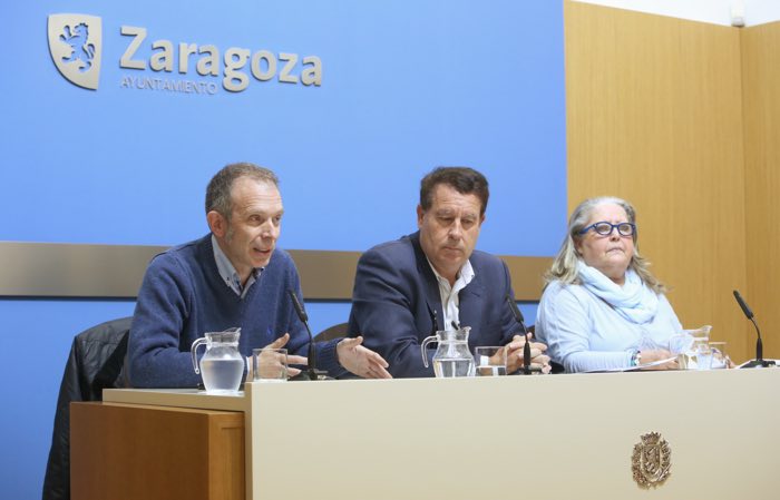 Presentando estas novedades, el presidente de la asociación histórico cultural Voluntarios de Aragón, Luis Sorando, el consejero de Cultura del Ayuntamiento de Zaragoza, Jerónimo Blasco, y la jefa de programación de Zaragoza Cultural, Carmen Blasco.