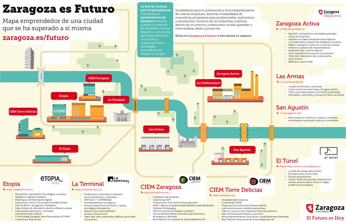 Zaragoza cuenta con una red de equipamientos en los que se presta ayuda a los jóvenes para labrarse un futuro prometedor, en el que sus ideas se convierten en negocio, donde se combina el espíritu emprendedor con la innovación y la creatividad. El camino comenzó hace cinco años, en 2010, cuando abrió sus puertas Zaragoza Activa. Desde entonces le han seguido Etopia, La Terminal, CIEM Zaragoza, CIEM Torre Delicias, Las Armas, San Agustín y El Túnel. Todos ayudan, forman, asesoran a esos jóvenes con talento que hay en Zaragoza y que quieren convertir sus sueños en empleo innovador y creativo.