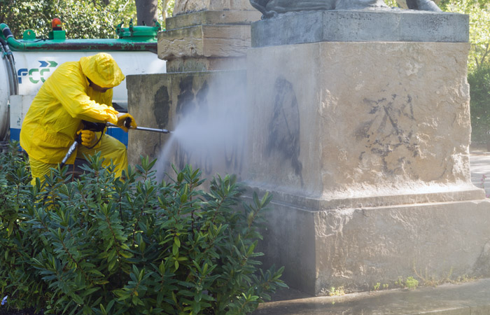Pero en casos que requieren un tratamiento especial como en obras creadas con material muy poroso o que están agrietadas, se precisa de la intervención del servicio de Patrimonio e Historia Cultural del Ayuntamiento de Zaragoza para que establezca cuál es el protocolo de actuación específico que se debe seguir para no dañar la escultura o monumento.