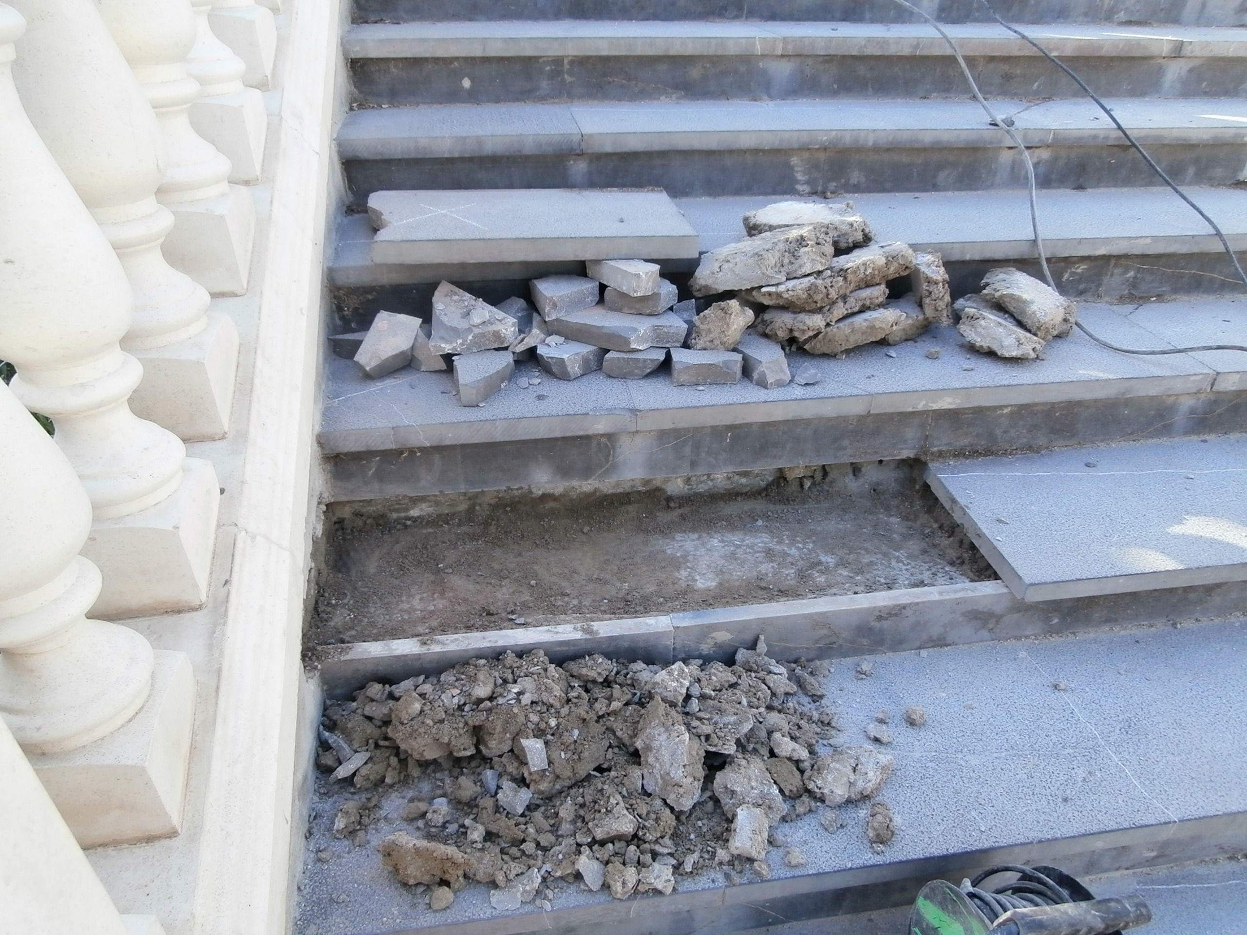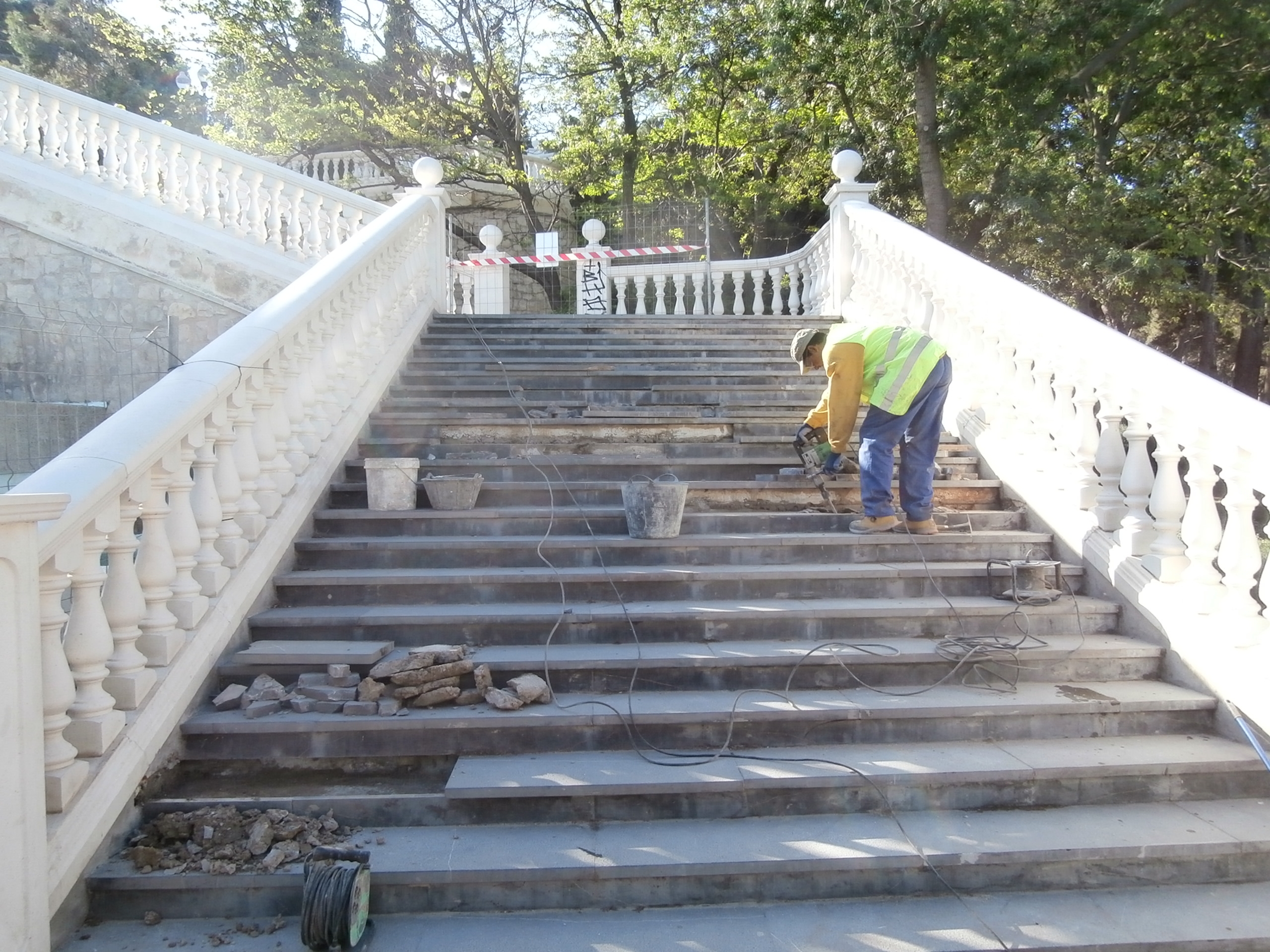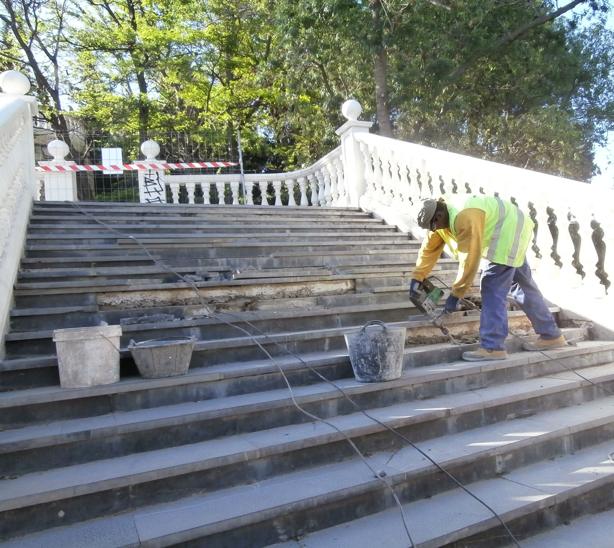 Se ha considerado que a causa de una mala ejecución y de un mal mantenimiento en periodo de garantía, se han generado una serie de desperfectos que pueden poner en peligro la seguridad de los usuarios que transiten por la escalinata. En compensación y con cargo al aval que depositó la adjudicataria, se está llevando a cabo una nueva reparación de desperfectos.