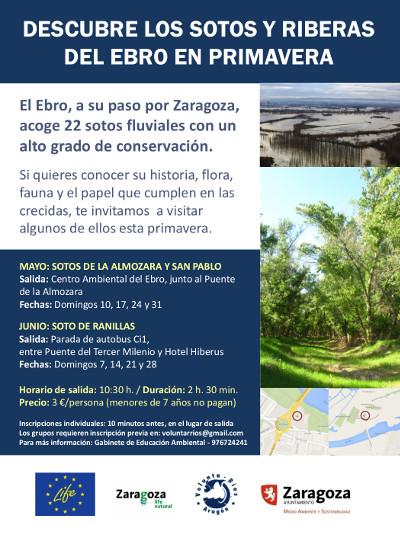 El Ebro en su recorrido por el municipio de Zaragoza acoge 22 sotos fluviales con un alto grado de conservación. Este programa medioambiental enmarcado en el Proyecto Life Zaragoza Natural pretende promocionar, difundir y descubrir el rico patrimonio fluvial que tenemos en la ciudad así como los aspectos históricos y culturales ligados al mismo.