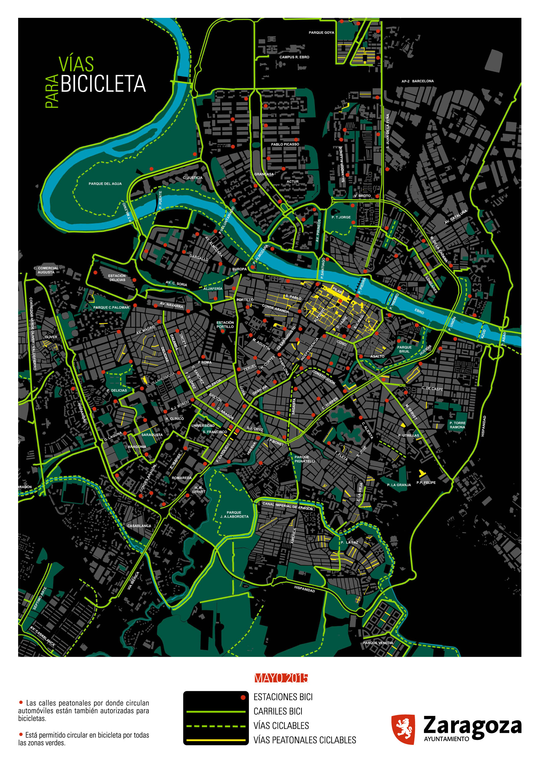 El Ayuntamiento de Zaragoza ha elaborado un plano con las Vías Ciclables que recoge las calles peatonales autorizadas para la circulación de bicis, los carriles y vías ciclables y las estaciones del servicio Bizi. Este documento se enmarca dentro de las actividades paralelas de la exposición 'Las bicicletas son para Zaragoza', que desde el pasado mes de abril ha estado abierta al público en el Centro Ambiental del Ebro.
