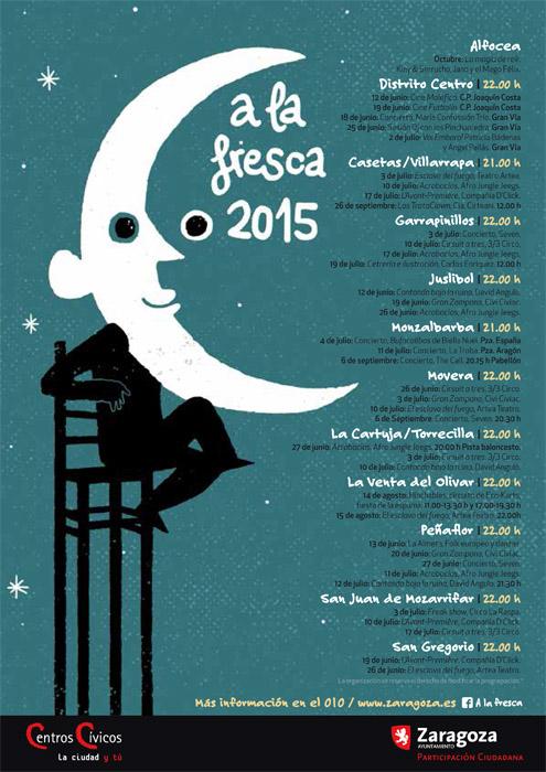 Continúa la programación cultural A la fresca en los barrios rurales durante este fin de semana. Se trata de la décima edición de esta programación que organiza el Ayuntamiento de Zaragoza, a través del servicio de Centros Cívicos, con el fin de que la oferta de ocio, tiempo libre y cultura de la ciudad llegue igualmente a los barrios rurales que circundan el centro de Zaragoza.