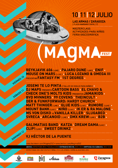 En esta segunda edición, Magma contará con artistas de la electrónica internacional como los alemanes Mouse on Mars y los británicos DMX Krew y Slugabed, que, sobre el papel, son los platos fuertes del festival. Mouse On Mars y DMX Krew son historia viva de la música electrónica y muestra de que con largas carreras se puede seguir sorprendiendo con cada nuevo trabajo, mientras que Slugabed es uno de los máximos exponentes de la nueva escena de los beats.También recibiremos la visita de Mount Bank -uno de los últimos fichajes de Donky Pitch- y de Luca Lozano & Omega III con su homenaje a los ritmos de las radios piratas británicas.