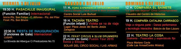 La programación comienza con un pasacalle inaugural, a partir de las 19,30 horas, por las principales calles del Casco Histórico, para continuar con una fiesta de inauguración en La Bóveda del Albergue. Para el sábado y el domingo, días 4 y 5 de julio, está prevista una variada programación por las mañanas con espectáculos infantiles, por la tarde con espectáculos familiares y en las noches con funciones de gala.