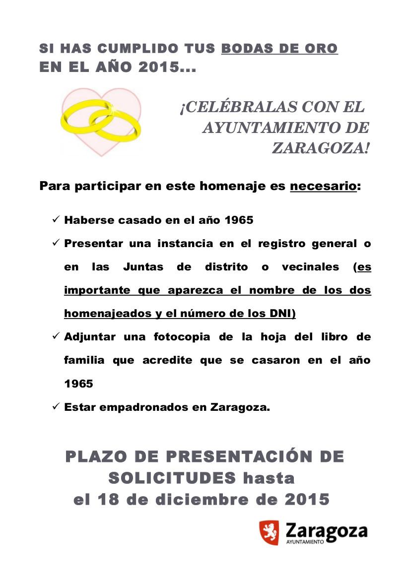 El Ayuntamiento de Zaragoza ha abierto el plazo de inscripción para las parejas que en el año 2015 cumplan 50 años de casados y quieran festejar este evento con sus familias y con otros matrimonios que también llevan medio siglo de unión.