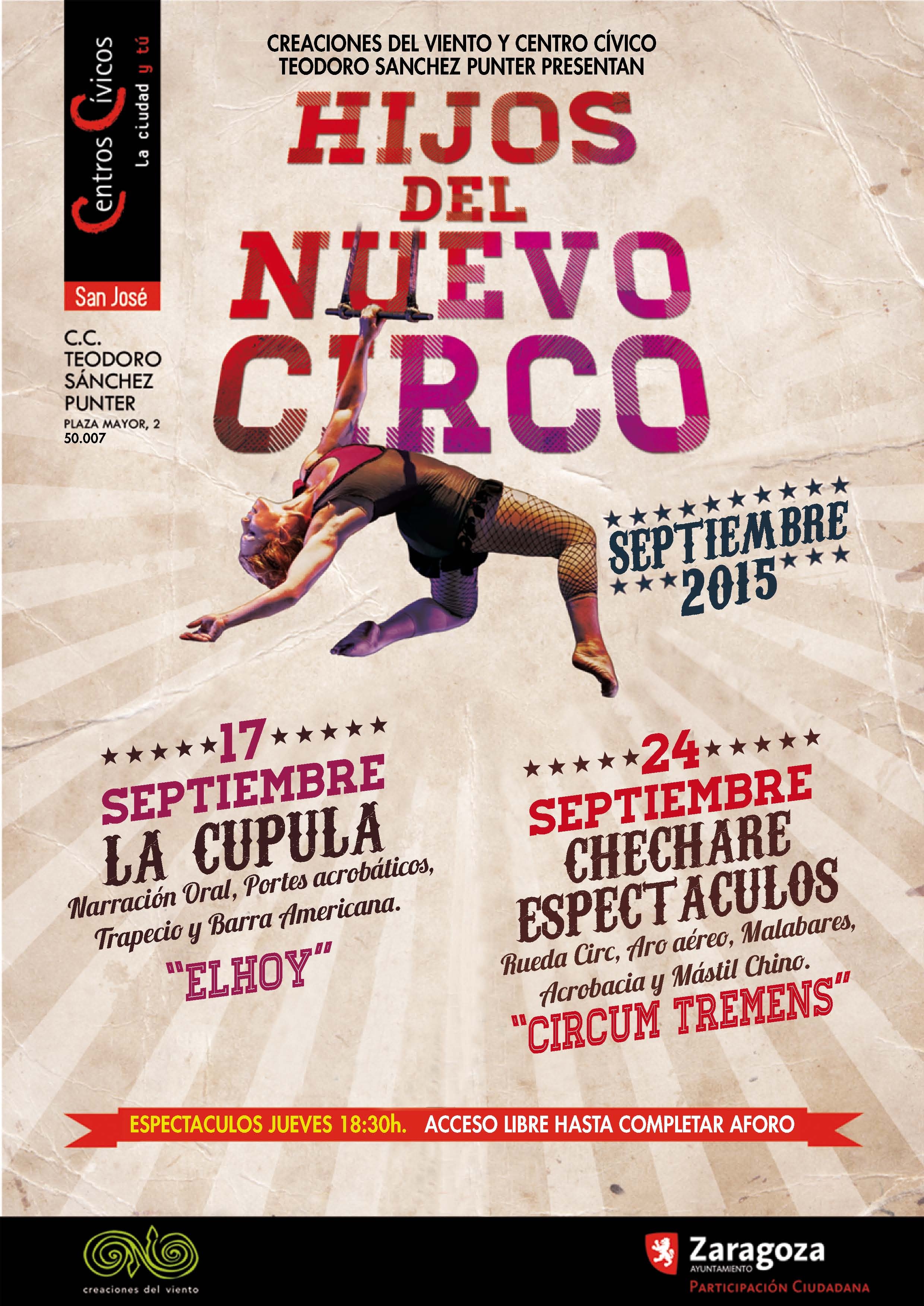 Mañana jueves, 24 de septiembre, el salón de actos del Centro Cívico Teodoro Sánchez Punter de San José (Plaza Mayor, 2) acogerá el segundo espectáculo de Hijos del Nuevo Circo, una actividad que organiza el Ayuntamiento de Zaragoza y la entidad Creaciones del Viento.