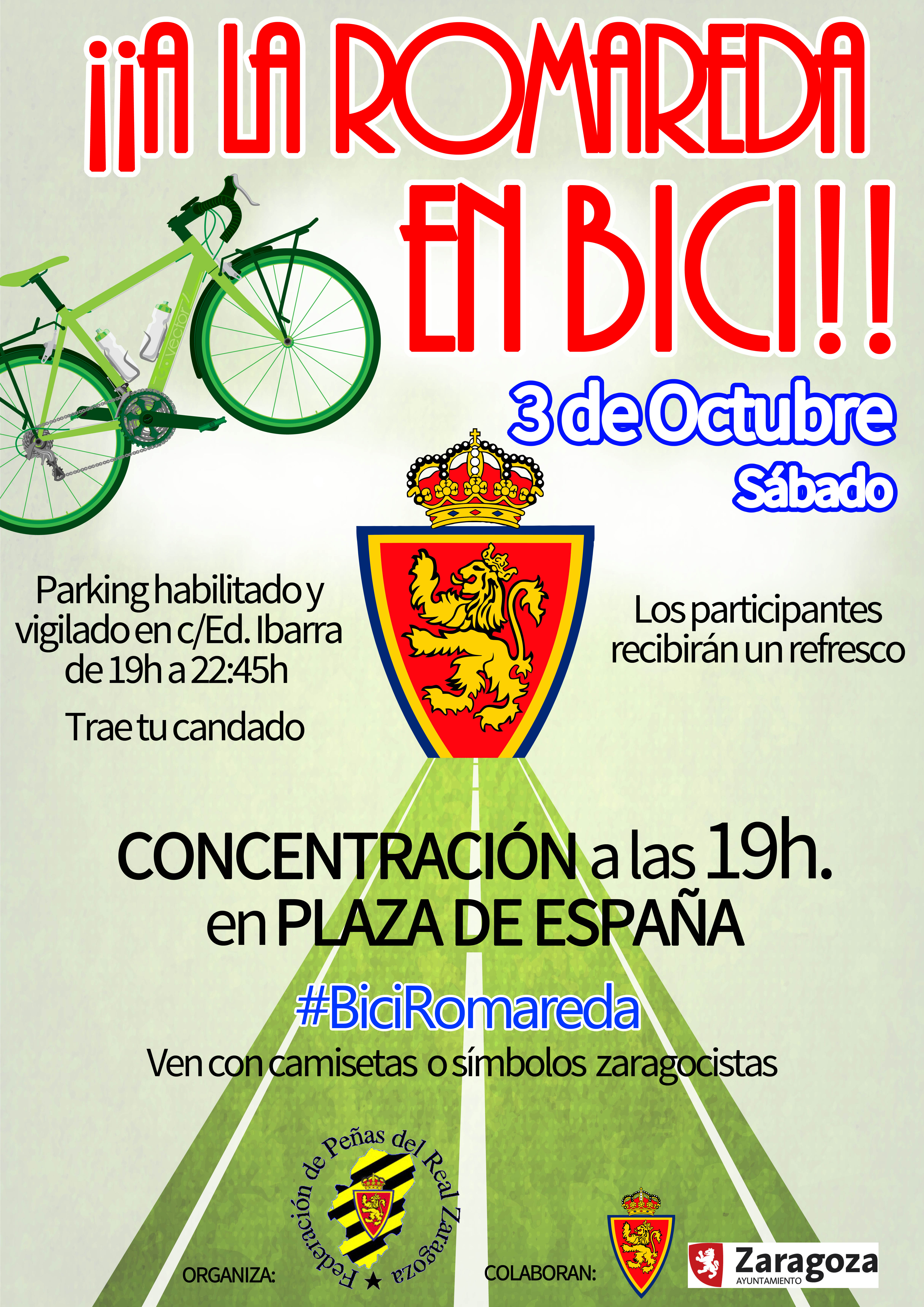 La Federación de Peñas del Real Zaragoza, en colaboración con el Ayuntamiento de la ciudad, ha organizado para este sábado, 3 de octubre, la actividad "¡¡A la Romareda en bici!!", coincidiendo con el partido frente al Deportivo Alavés.