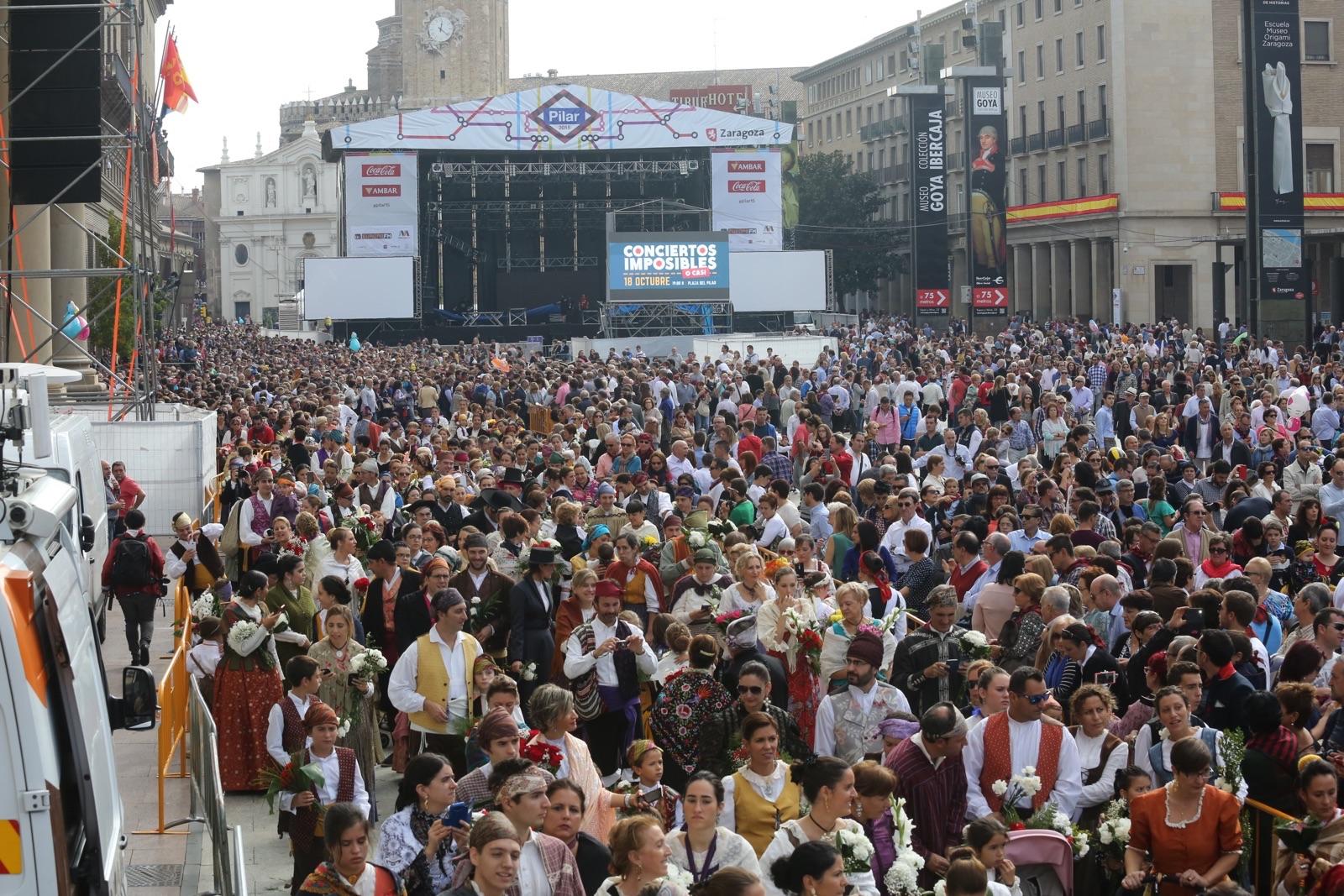 La Ofrenda de Flores a la Virgen del Pilar, sin duda el acto más relevante y significativo de las fiestas, está batiendo este año su récord de participación, tanto en número de grupos participantes (621 grupos) como en participantes individuales. A las 12.00 horas habían participado ya 300 grupos, y depositado su ofrenda floral más de 70.000 personas. Desde las 7.30 horas de la mañana hasta las 17.00 horas, no se ha producido ninguna incidencia digna de reseñar. Está previsto que finalice sobre las 20.30 horas (dentro del horario previsto, y los oferentes depositarán 8 toneladas de flores.