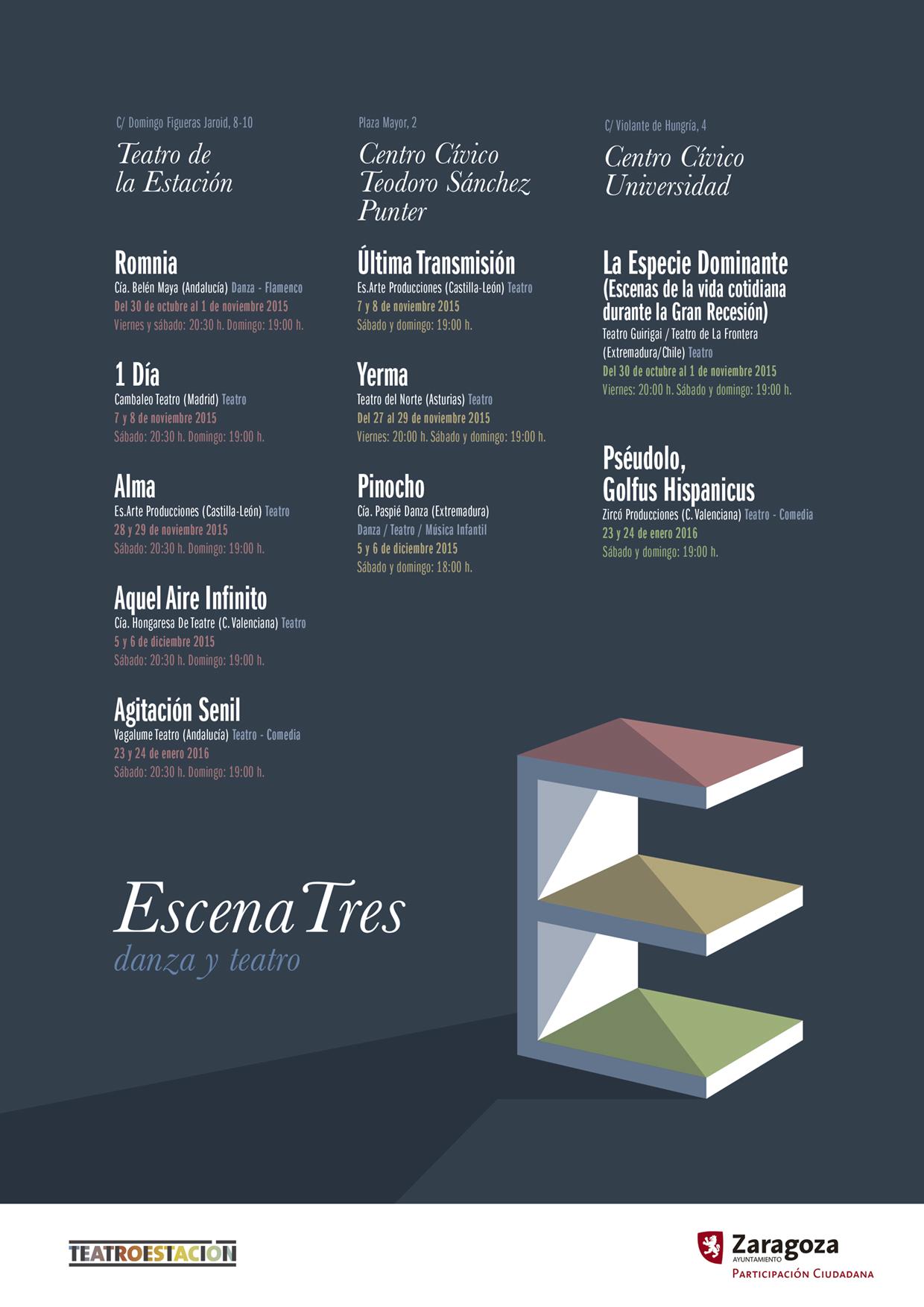 Continúa, de cara a este fin de semana, la programación Escena Tres que se esta desarrollando en el Centro Cívico Teodoro Sánchez Puntter de San José y en el Teatro de la Estación, con las siguientes actuaciones: