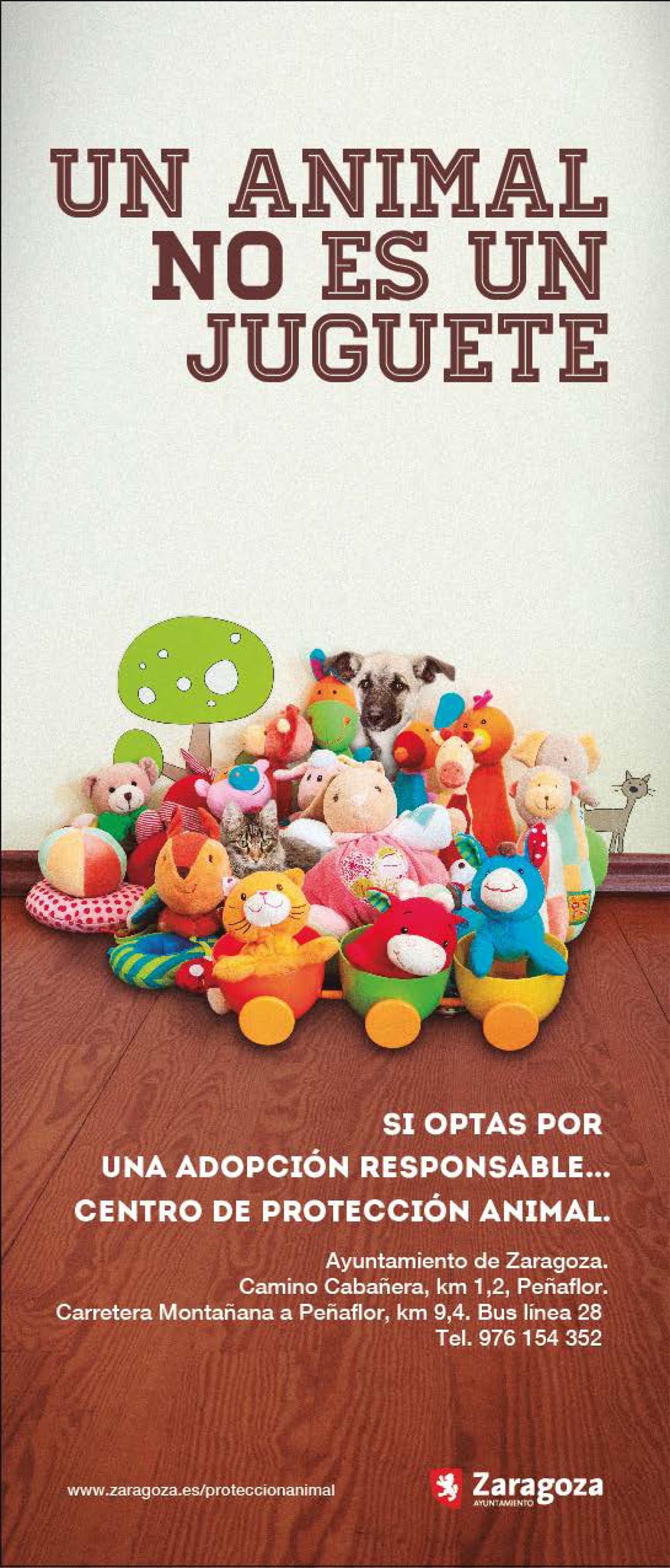 El Ayuntamiento de Zaragoza pone en marcha una nueva edición de la campaña "Un animal no es un juguete", con la que pretende concienciar sobre la necesidad de cuidar a los animales domésticos y mascotas. La campaña se va a llevar cabo durante esta época navideña, habitual de compra de animales para regalar, a través de distintos soportes (mupis, cuñas de radio, etcétera).