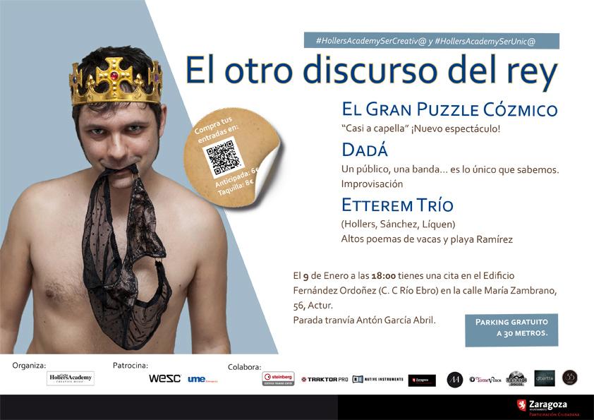 Este fin de semana el Centro Cívico Río Ebro (C/María Zambrano, 56) acogerá dos grandes actuaciones y de calidad para todos los ciudadanos. Así, el sábado 9 de enero, a las 18,00 horas, diferentes artistas, como Dadá, El Gran Puzzle Cózmico y Etterem Trío, se unen en un formato diferente con el espectáculo titulado El otro discurso del rey.
