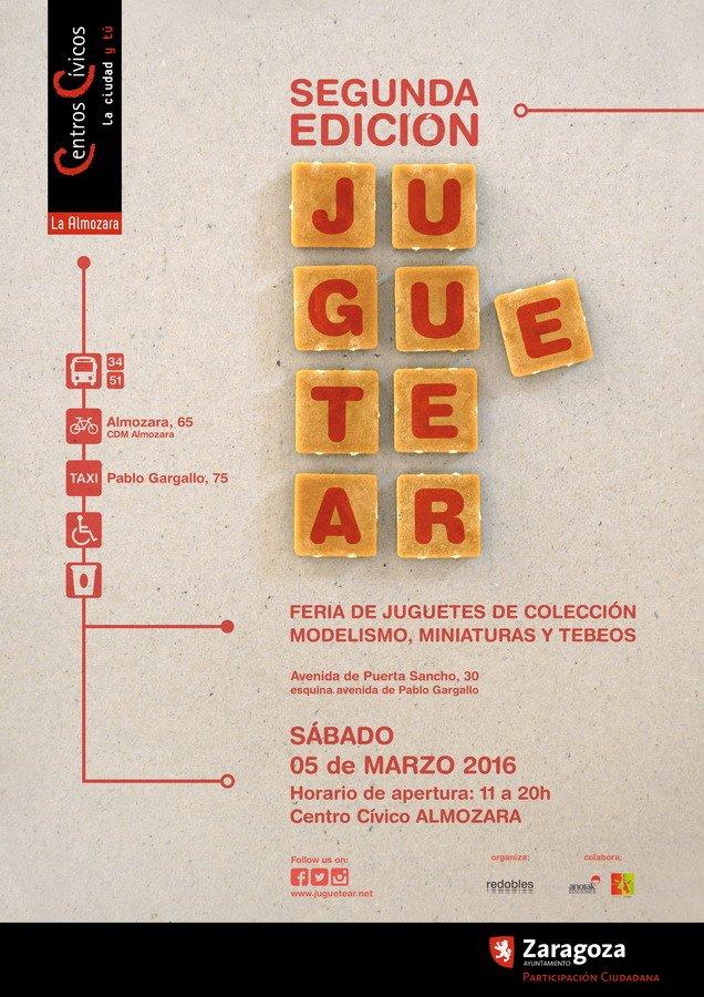 El Centro Cívico La Almozara (Avda. Puerta Sancho, 30) acoge mañana sábado, 5 de marzo, la segunda edición de Juguetear, la feria del juguetes de colección, modelismo, miniaturas y tebeos. El horario de apertura al público es de 11 a 20 horas. Y el domingo, 6 de marzo, a las 18,00 horas, el espectáculo infantil Melodías mágicas, con Mago Félix, Kiny y Jano. Entrada: 4?, que se puede adquirir una hora antes en taquilla.