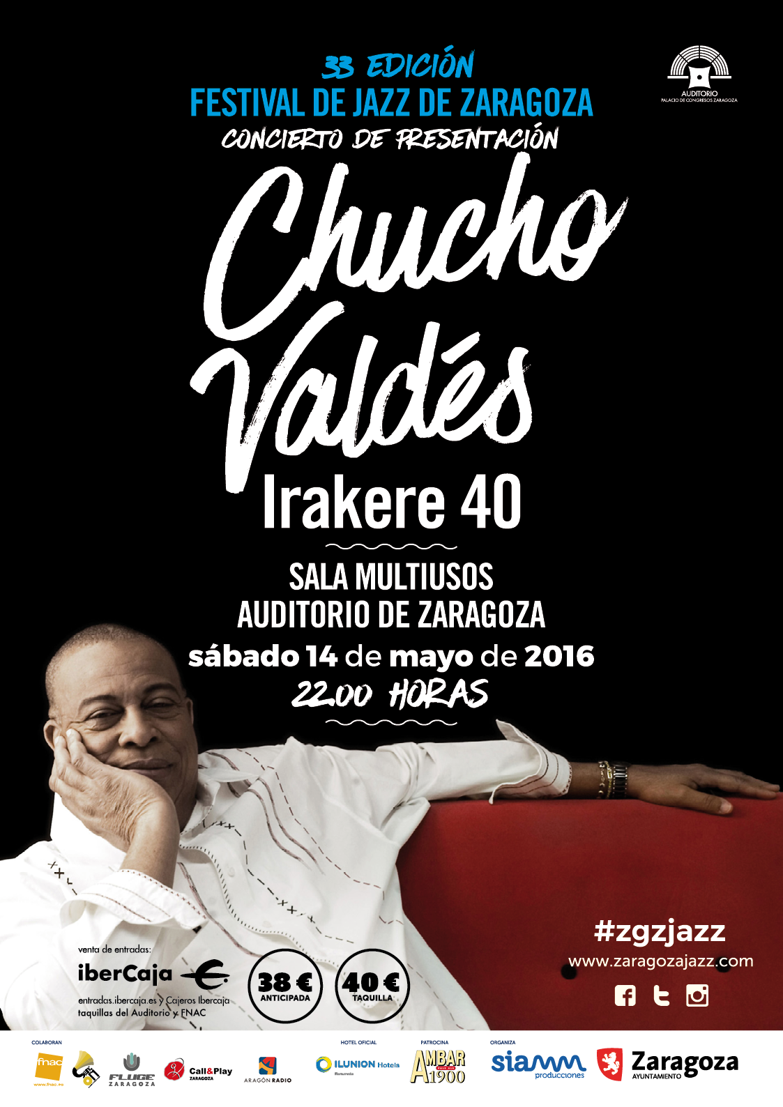 El Ayuntamiento de Zaragoza se suma a esta celebración, apoyando este concierto, organizado por Siamm Producciones, como preludio del Festival de Jazz de Zaragoza, que este año alcanza su 33ª edición. Además, Chucho Valdés ofrecerá también una retrospectiva de su trayectoria en el latin jazz en las últimas cuatro décadas.