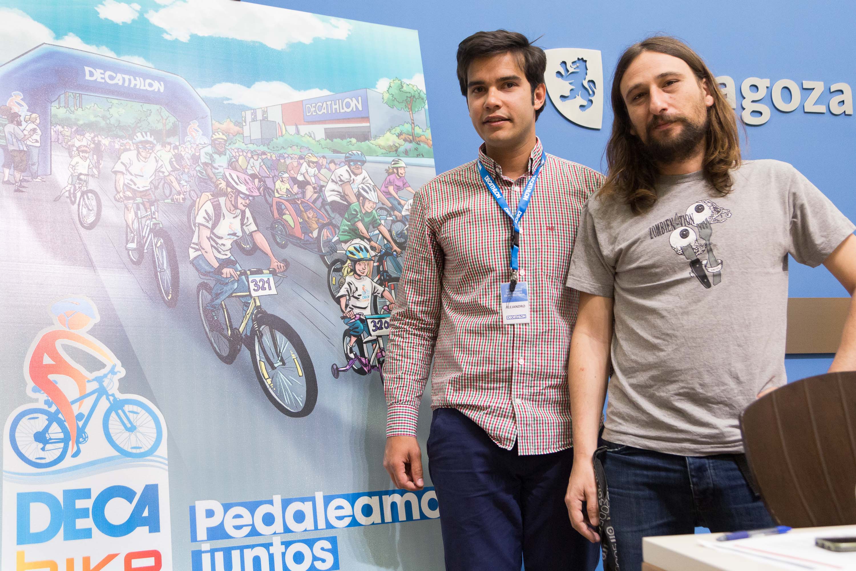El concejal de Deporte, Pablo Híjar, y el director de Decathlon Plaza Imperial, Alejandro Fernández, han presentado hoy en el Consistorio de la capital aragonesa la cuarta edición de Decabike, que ya se ha realizado en más de 70 ciudades bajo el lema "Pedaleamos juntos" y que espera alcanzar los 700 participantes.