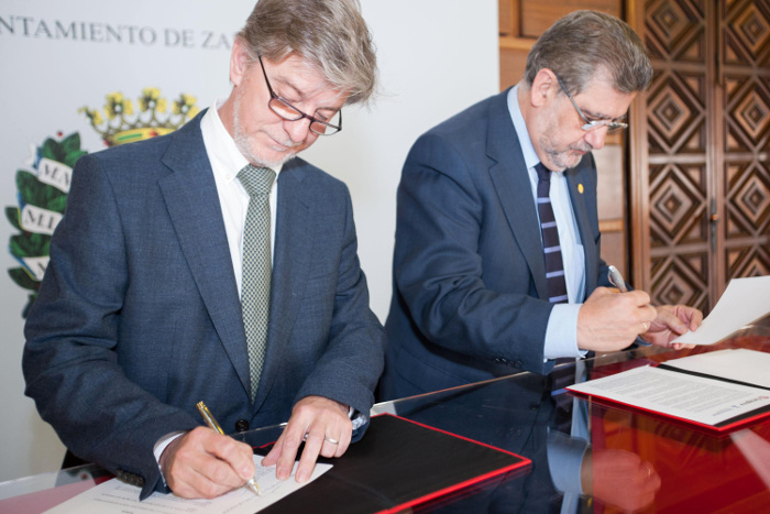 El alcalde de Zaragoza, Pedro Santisteve y el rector de la Universidad de Zaragoza, José Antonio Mayoral, han firmado hoy el convenio creación de la Cátedra de Participación e Innovación Democrática, la primera de estas características en Aragón.