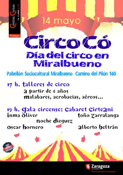 En los próximos días, los ciudadanos podrán disfrutar de algunas de las actividades más sonadas de la programación como el Circo Có, un día dedicado al circo en el que participan artistas locales como Inma Oliver, Toño Zarralanga y Antonio Beltrán, entre otros. Durante la jornada se impartirán talleres de iniciación en diferentes disciplinas circenses como equilibrios, malabares o clown. Este día dedicado al universo del circo tendrá lugar el sábado, 14 de mayo, en el Pabellón Sociocultural Miralbueno desde las cinco hasta las siete de la tarde.
