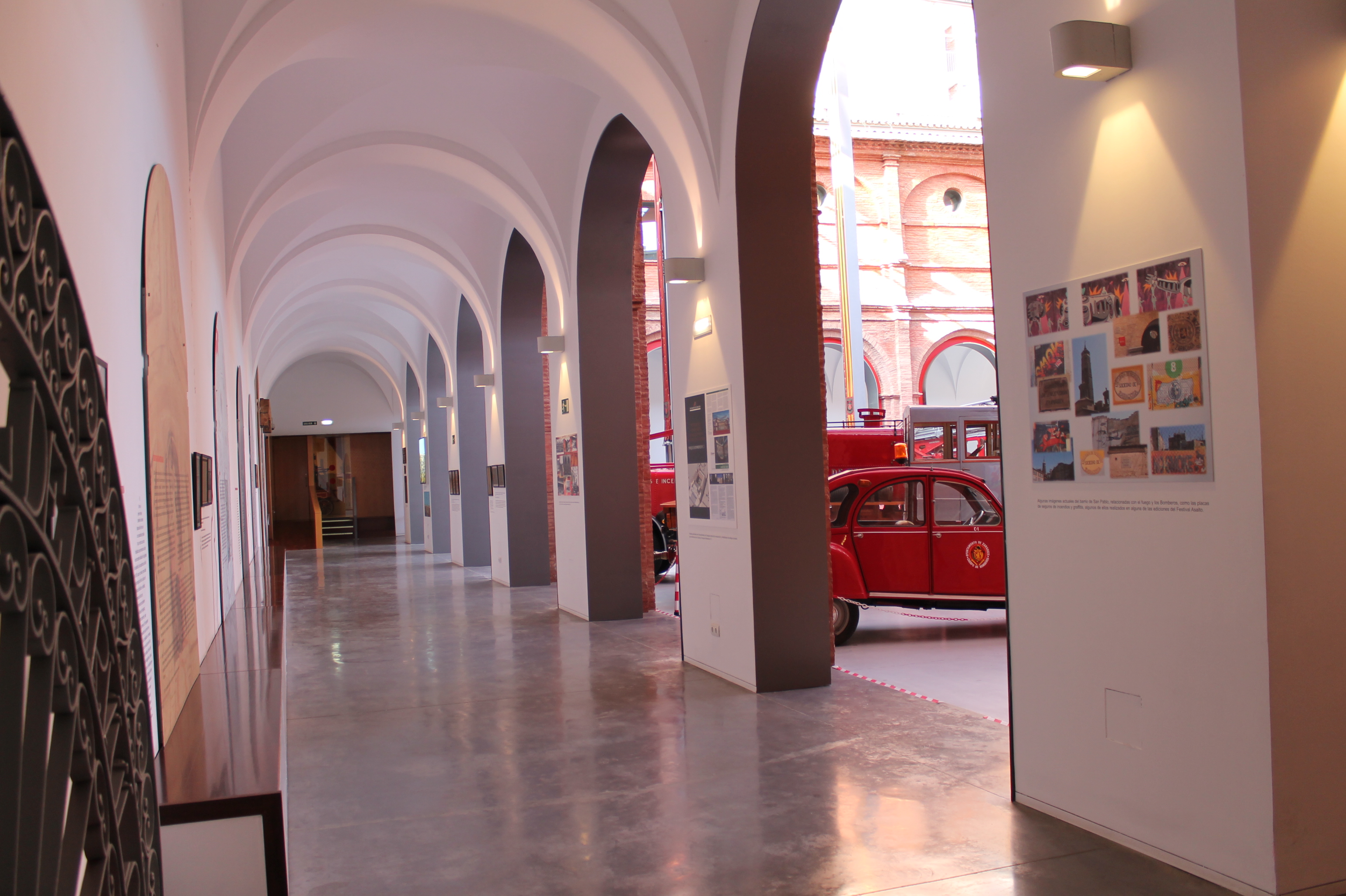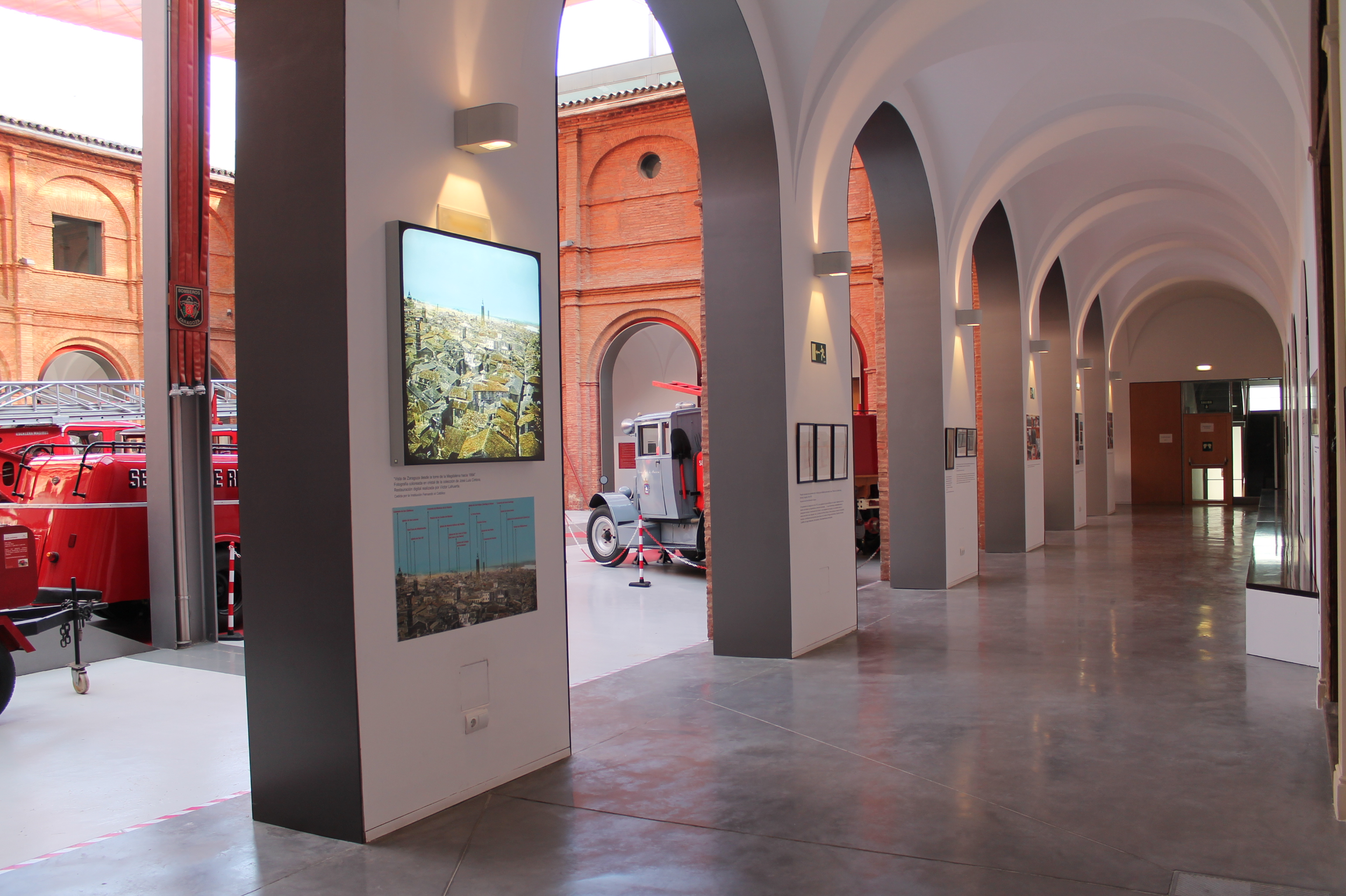 Otro espacio nos enseña un fotomontaje con las publicaciones del año 2003, en el que el Ayuntamiento de Zaragoza finalizó la restauración y rehabilitación del antiguo Convento de Mínimos de la Victoria, para destinar definitivamente el edificio al hoy conocido como Parque de Bomberos nº 2. Otro fotomontaje muestra los diferentes usos municipales del edificio a lo largo de su historia, tales como, Parque de Bomberos, Escuelas, Brigadas municipales, etc.