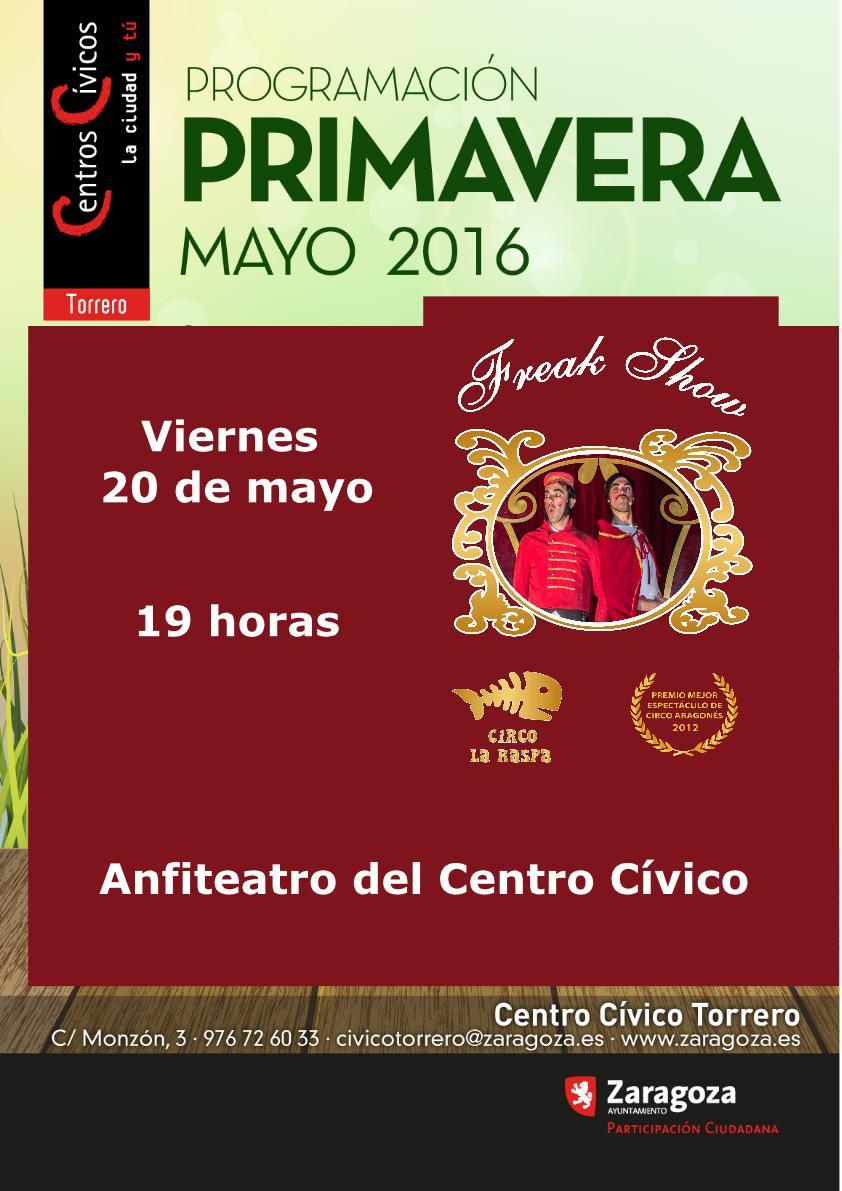Dentro de la programación cultural de primavera que se desarrolla en el Centro Cívico Torrero, señalar que a las 19,00 horas de hoy viernes, 20 de mayo, los asistentes podrán disfrutar, en el Anfiteatro, del espectáculo de circo Freak Show, a cargo de Circo La Raspa, compañía que el pasado 2015 fue Premio revelación de las Artes Escenénicas de Aragón.
