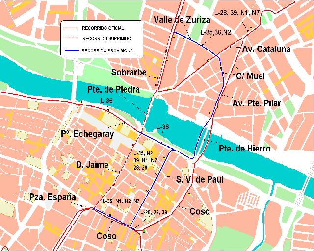 Líneas 35, 36 y N2: Desde la calle San Juan de la Peña se desviarán por Zuriza, Muel, Av. Pte. Pilar, Echegaray. La Línea 36 a su recorrido por Pº Echegaray y el resto de líneas por San Vicente de Paúl - Coso a su recorrido habitual.