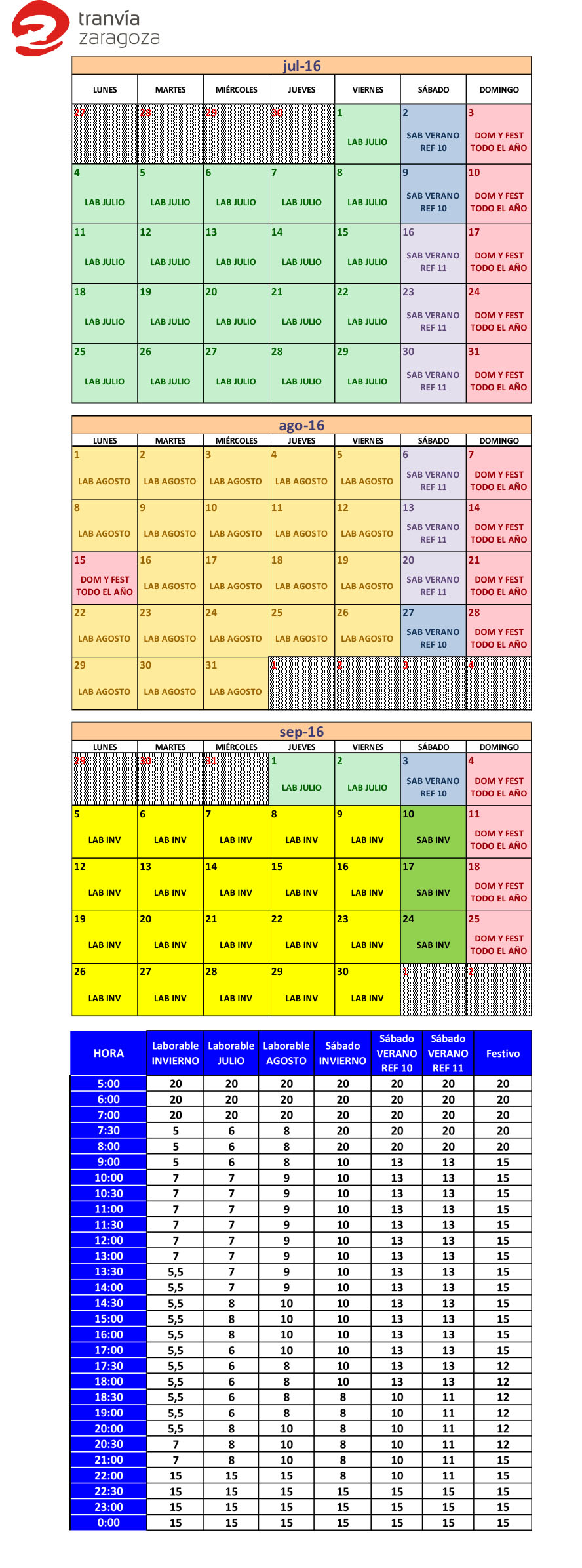 Con respecto al tranvía, se adjunta documentación con el calendario de verano por tipo de día, así como tabla anexa explicativa de las frecuencias (en minutos) establecidas por franja horaria para cada tipo de día.