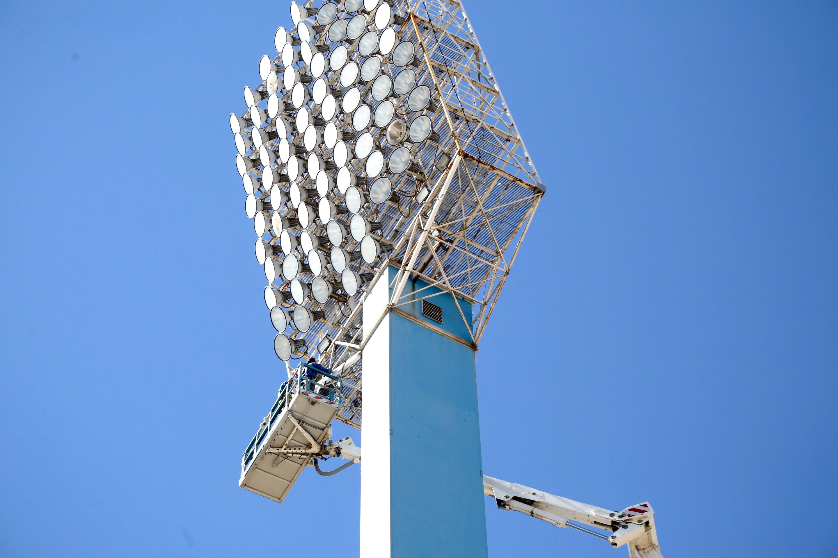 Esta mañana ha comenzado la reparación de la torre de iluminación del Estadio Municipal de La Romareda ubicada en el ángulo suroeste, para lo que se ha instalado una grúa de grandes dimensiones homologada para realizar trabajos de soldadura a más de 50 metros de altura.