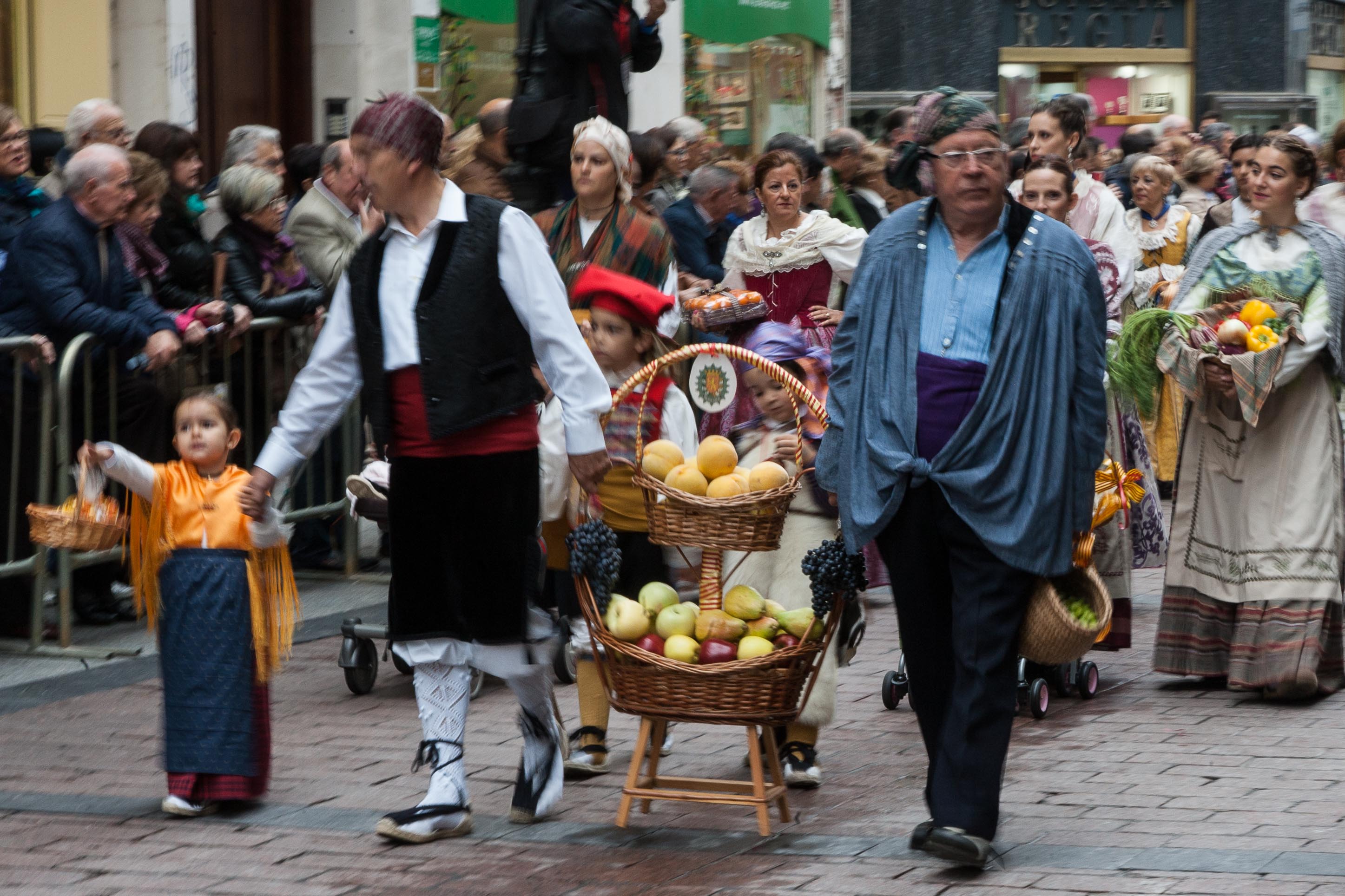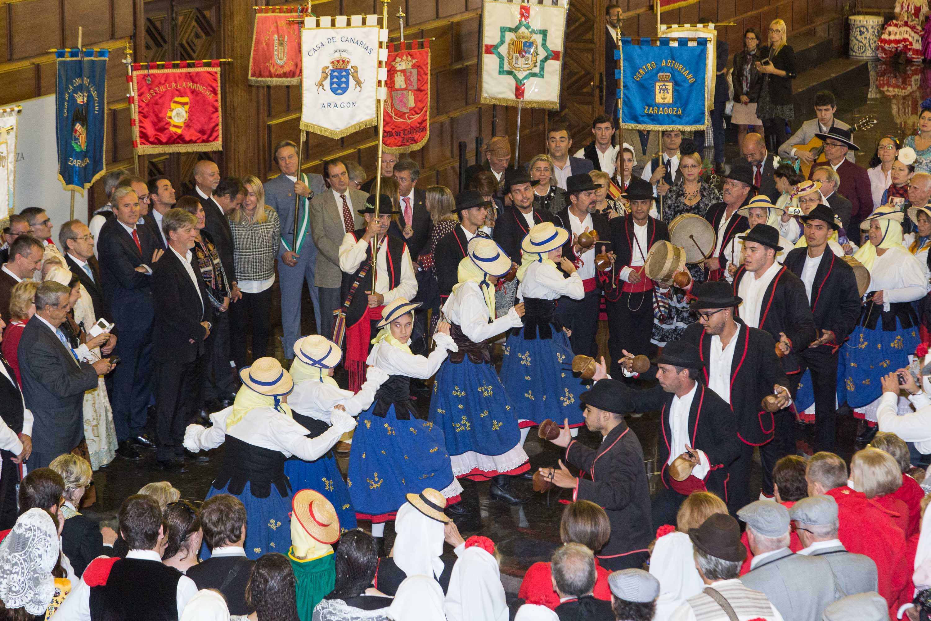 A las 11 horas de la mañana ha partido, desde la Plaza Santa Engrancia, la Ofrenda que ha transcurrido por Paseo Independencia, Plaza España, Coso y Calle Alfonso, hasta llegar a la Plaza del Pilar, donde los participantes, ataviados con sus trajes regionales, han depositado sus cestas llenas de frutas, verduras, entre otros productos alimenticios.