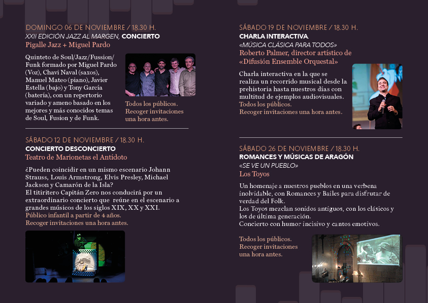Las siguientes actuaciones correrán a cargo del grupo Teatro de Marionetas el Antídoto, con su espectáculo musical "Concierto Desconcierto" el día 12 de noviembre; Roberto Palomar, que ofrecerá una charla interactiva titulada "Música clásica para todos" el día 19; y Los Toyos y su recital de folclore mezclado con humor incisivo "Se ve un pueblo", el día 26 de noviembre.