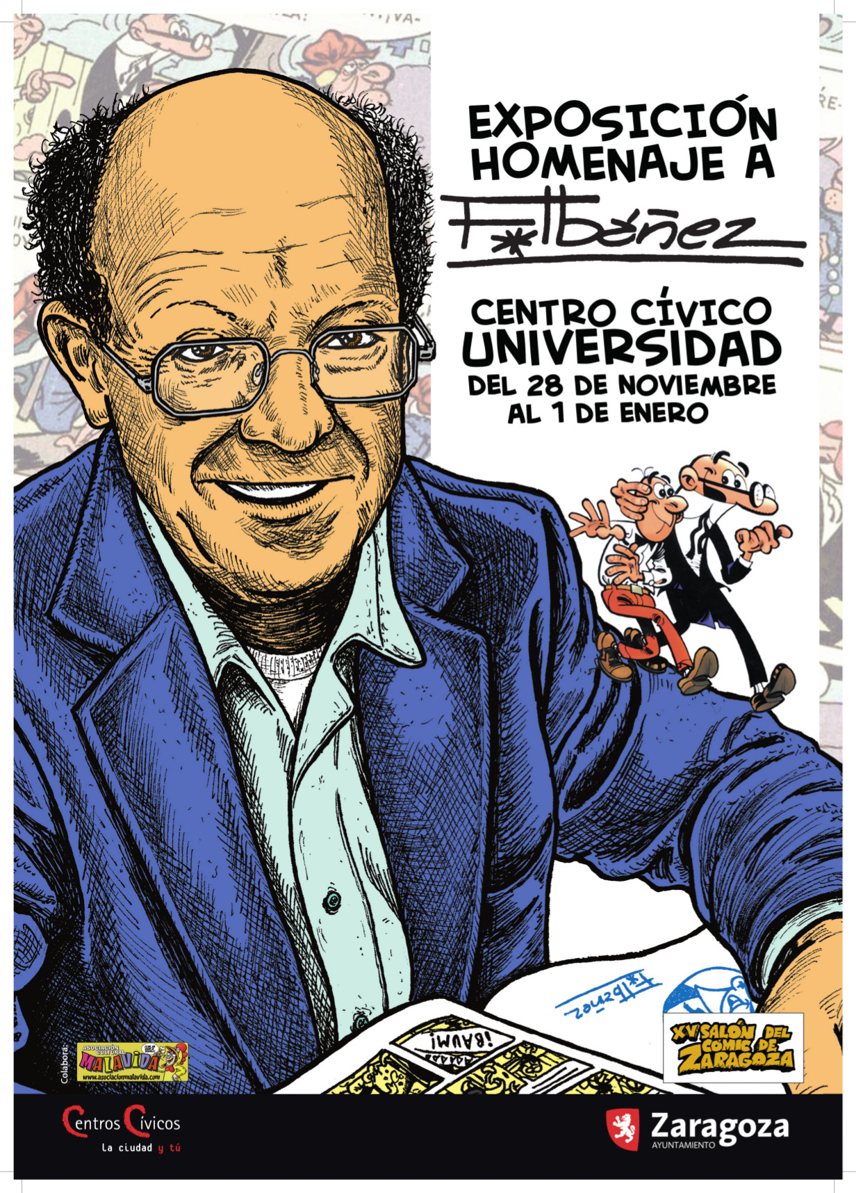 Así, este #diciembremesdelcomic se abre ya hoy con un Homenaje a Francisco Ibáñez en el Centro Cívico Universidad (c/ Violante de Hungría, 4). Esta exposición, organizada por el Servicio de Centros Cívicos como complemento al Salón del Cómic -organizado, asimismo, desde dicho Servicio-, está comisariada por el autor aragonés Santi Jurado y cuenta con la colaboración de los autores aragoneses Angelito Perkele, Azagra and Revuelta, José Antonio Bernal, Carlos A. Liste, Chema Cebolla, Dani García Nieto, Diego Canalejas, Dionisio Platel, Ed Wood, Carlos Melgares, Eloy Yanguas, Furillo, Gonzalo Royo, Juanfer Briones, Kalitos, Luis Orús, Marcos J Wander, Mike Remacha, Moratha, Pedro Abad, Ruben Caraban, Santi Blasco, Santi Jurado, Sergio García, Sofía Paz y Xcar Malavida. El Homenaje a Ibáñez estará abierto al público hasta el día 8 de enero.