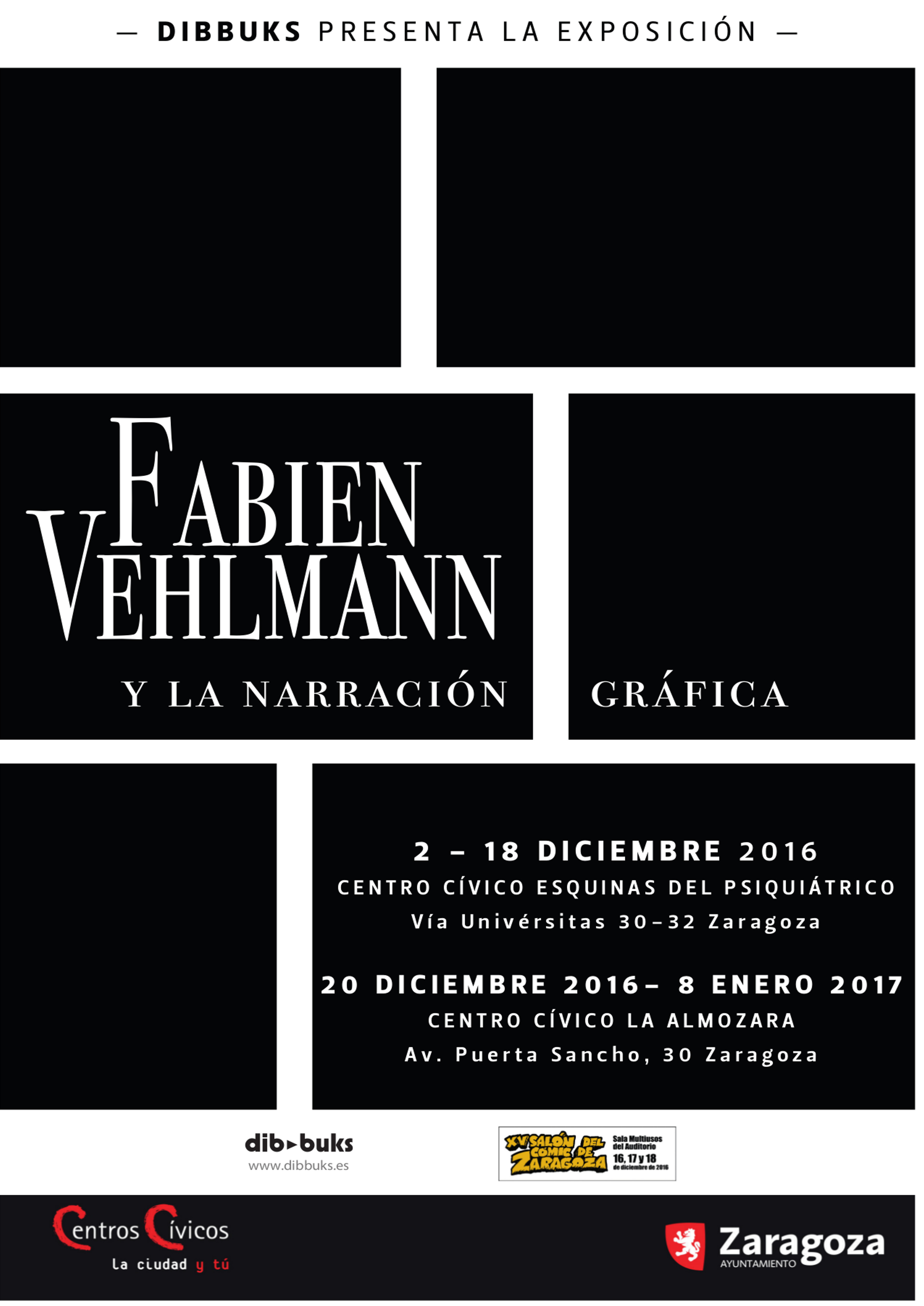 Otro centro cívico municipal, el de las Esquinas del Psiquiátrico (Vía Universitas, 30-32), acoge del 2 al 18 de diciembre la exposición Fabien Vehlmann y la Narración Gráfica. Partiendo de la figura del guionista francés Fabien Vehlmann, la muestra explica el trabajo de escritura del cómic, la interacción entre el guionista y su dibujante, y los problemas que pueden encontrar o anécdotas que han vivido durante la creación. Las obras sobre las que hace su reflexión son Espiro (Loan), Solos (Bruno Gazzotti), Green Manor (Denis Bodart) y Un futuro sin nubes (Ralph Meyer). Esta exposición está organizada por el Salón del Cómic de Zaragoza en colaboración con la Editorial Dibbuks.